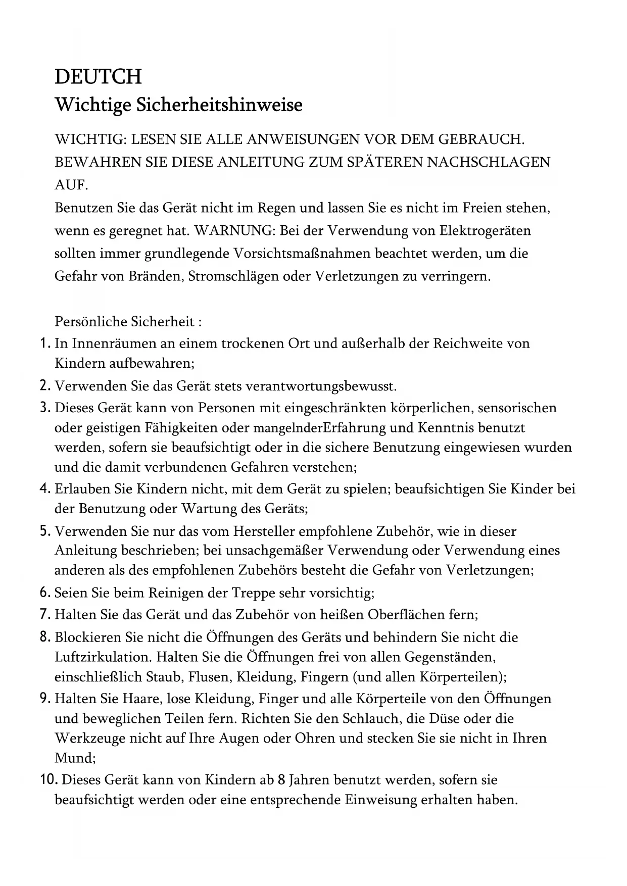 1. Dieses Gerät ist ausschließlich für das Trockenstaubsaugen im Haushalt