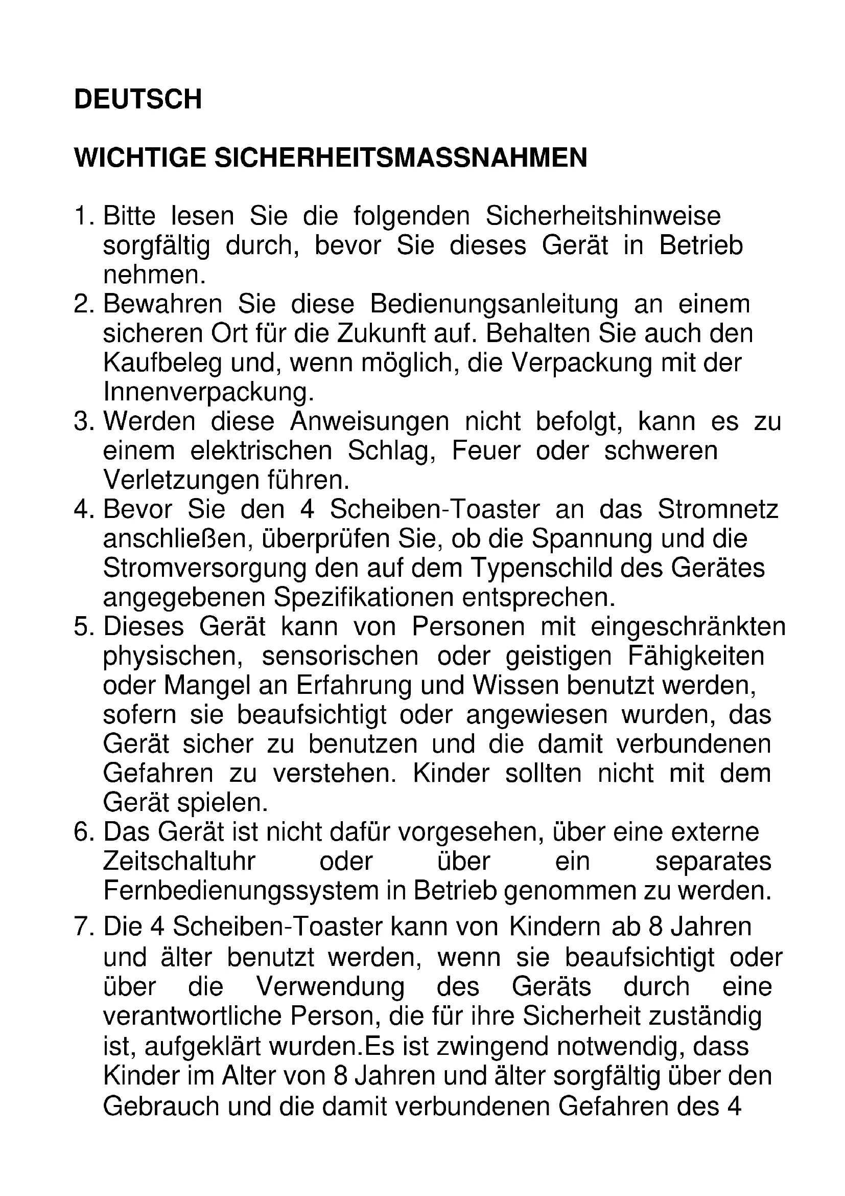 Die 4 Scheiben-Toaster kann von Kindern ab 8 Jahren und älter benutzt werden, wenn sie beaufsichtigt oder über die Verwendung des Geräts durch eine verantwortliche Person, die für ihre Sicherheit zuständig ist, aufgeklärt wurden.Es ist zwingend notwendig, dass Kinder im Alter von 8 Jahren und älter sorgfältig über den Gebrauch und die damit verbundenen Gefahren des 4Scheiben-Toaster auf sichere Weise angewiesen werden, und sie es verstehen. Es sollte Kindern nur erlaubt sein den 4 Scheiben-Toaster zu reinigen, wenn sie von Erwachsenen beaufsichtigt werden.