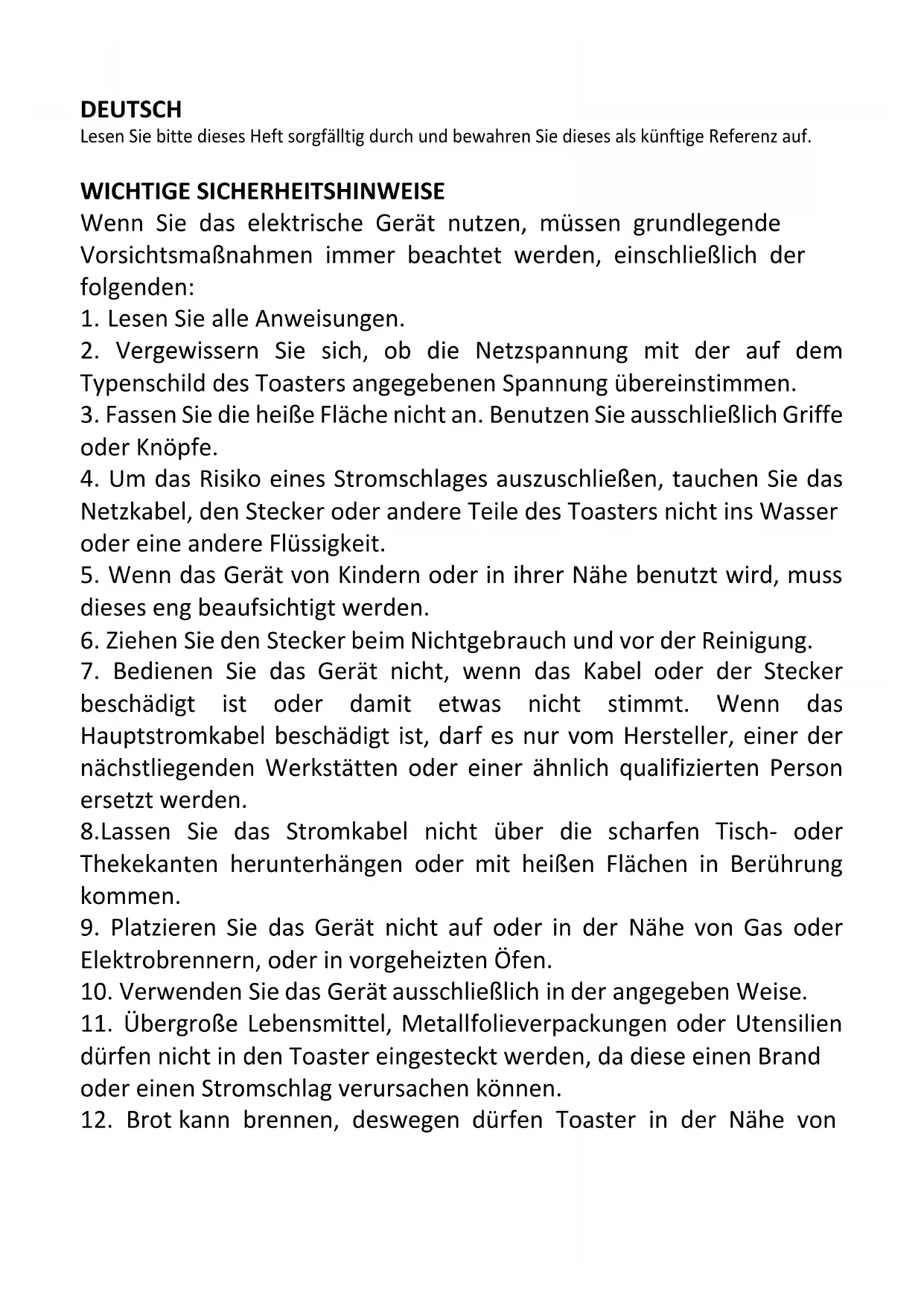 dürfen nicht in den Toaster eingesteckt werden, da diese einen Brand oder einen Stromschlag verursachen können. 12. Brot kann brennen, deswegen dürfen Toaster in der Nähe vonVorhängen oder unter diesen und anderen brennbaren Stoffen nicht benutzt werden, Aufsicht wird benötigt.