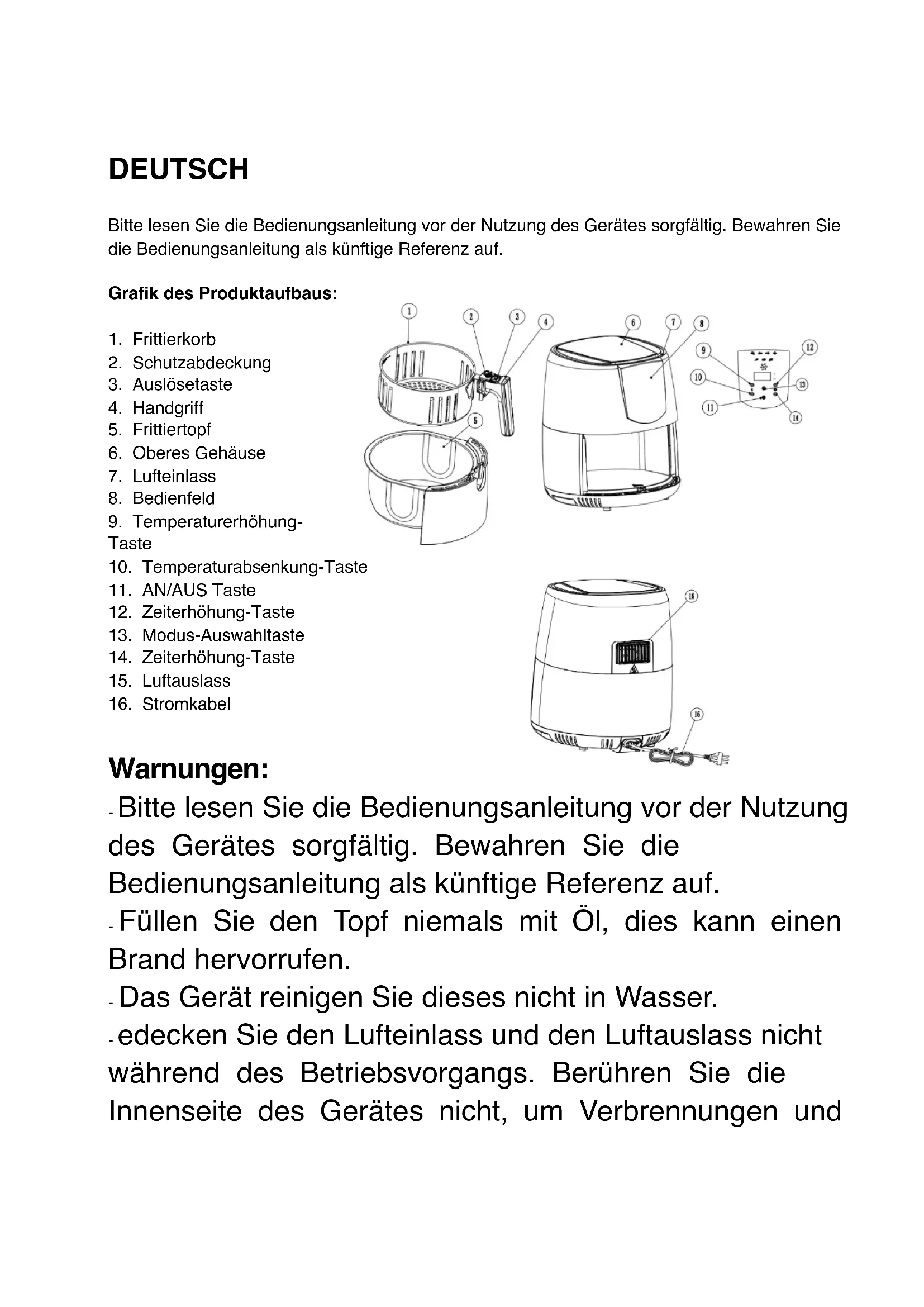 Warnungen: - Bitte lesen Sie die Bedienungsanleitung vor der Nutzung des Gerätes sorgfältig. Bewahren Sie die Bedienungsanleitung als künftige Referenz auf. - Füllen Sie den Topf niemals mit Öl, dies kann einen Brand hervorrufen. - Das Gerät reinigen Sie dieses nicht in Wasser. - edecken Sie den Lufteinlass und den Luftauslass nicht während des Betriebsvorgangs. Berühren Sie die Innenseite des Gerätes nicht, um Verbrennungen undVerbrühungen zu vermeiden. - Die Flächen werden während der Nutzung heiß. Berühren Sie die heißen Flächen nicht. Benutzen Sie den Griff oder den Regler. - Heißluft wird durch den Auslass des Gerätes während der Nutzung entweichen. Bitte halten Sie einen sicheren Abstand. Berühren Sie die heißen Flächen nicht, stehen Sie nicht zu nah am Luftauslass. Wenn Sie den Topf herausziehen, achten Sie auf die Heißluft. Sicherheitshinweise: - Halten Sie bitte den Stecker sauber, um Gefahren zu vermeiden. - Beschädigen Sie das Kabel nicht, ziehen Sie nicht daran und verdrehen Sie dieses nicht, benutzen Sie das Kabel nicht, um schwere Gegenstände zu tragen; Verändern Sie das Kabel nicht, lassen Sie es nicht über die Kante eines Tisches oder einer Theke hängen oder mit heißen Flächen in Berührung kommen, um einen Stromschlag, einen Brand oder andere Unfälle zu vermeiden. - Schließen Sie das Gerät nicht an und trennen Sie es nicht vom Netz mit nassen Händen. - Stecken Sie das Gerät fest ein, ansonsten kann es zu einem Stromschlag, einem Kurzschluss, Rauch, Funkenbildung und anderen Gefahren führen. - Tauchen Sie das Gerät, das Gehäuse, das Kabel oderden Stecker nicht in Wasser oder andere Flüssigkeiten, um sich vor einem Stromschlag zu schützen und die Leistung des Gerätes nicht zu beeinträchtigen. - Platzieren Sie das Gerät nicht in Anwesenheit von explosiven und/oder entflammbaren Dämpfen. - Platzieren Sie das Gerät nicht in Anwesenheit von explosive und/oder entflammbaren Dämpfen. - Platzieren Sie das Gerät nicht auf oder in der Nähe von entflammbaren Stoffen, wie z.B. einer Tischdecke und anderen, um Gefahren zu vermeiden; - Benutzen Sie das Gerät umbedingt auf einer hitzeresistenten und ebenen Fläche. Halten Sie das Gerät mindestens 30cm entfernt von der Wand, Möbeln oder anderen entflammbaren Gegenständen; - Das Gerät ist nicht dafür geeeignet, mithilfe einer externen Schaltuhr oder eines separaten Fernbedienungssystem bedient zu werden. - Benutzen Sie das Gerät nur zum dafür vorgesehenen Zweck; - Kinder müssen beaufsichtigt werden, um sicherzustellen, dass sie mit dem Gerät nicht spielen. - Halten Sie das Gerät fern von Kindern, um Verbrühungen, Stromschläge und/oder andere Verletzungen zu vermeiden; enge Aufsicht ist erforderlich, wenn das Gerät von -Dieses Gerät kann von Kindern ab 8 Jahre benutztwerden, solange sie beaufsichtigt werden und Anweisungen über die sichere Nutzung des Gerätes erhielten, und können die verbundenen Gefahren vollständig nachvollziehen. -Die Reinigung und Wartung dürfen von Kindern nicht durchgeführt werden, es sei den sie sind über 8 Jahre alt und werden von einem Erwachsenen beaufsichtigt. - Halten Sie das Gerät und sein Kabel außer Reichweite von Kindern unter 8 Jahren. - Während der Nutzung des elektrischen Gerätes müssen grundliegende Sicherheitsvorkehrungen immer getroffen werden, um das Risiko eines Brandes, eines Stromschlages und/oder einer Verletzung im Falle eines Missbrauchs zu vermeiden. -Vergewissern Sie sich, dass der Spannungswert auf dem Typenschild mit der Hauptspannung Ihrer Stromversorgung übereinstimmt. Wenn dies nicht der Fall ist, kontaktieren Sie Ihren Händler und schließen Sie das Gerät nicht an. - Lassen Sie das Gerät während des Betriebs niemals unbeaufsichtigt. - Öffnen Sie das Gerät nie von vorne, sondern stellen Sie sich immer leicht zur Seite, um sich nicht mit Dampf zu verbrennen. - Das Gerät darf nicht benutzt werden, wenn es fallen gelassen wurde, wenn auffällige Anzeichen einerBeschädigung sichtbar sind oder wenn es Leckagen aufweist. - Halten Sie bitte diese Anleitung griffbereit und geben Sie diese an den künftigen Besitzer im Falle der Übergabe des Gerätes weiter. - Bedienen Sie das Gerät nicht, wenn das Kabel oder der Stecker beschädigt sind, wenn es nicht richtig funktioniert, beschädigt oder fallengelassen wurde. Wenn das Stromkabel beschädigt ist, muss es von dem Hersteller, seinem Dienstleister oder einer ähnlich qualifizierten Person ersetzt werden, um Gefahren zu vermeiden. - Dieses Gerät kann von Personen mit eingeschränkten körperlichen, sensorischen oder geistigen Fähigkeiten oder mangelnder Erfahrung und Kenntnis benutzt werden, vorausgesetzt, dass sie beaufsichtigt oder in der sicheren Benutzung des Gerätes unterwiesen werden und die möglichen Gefahren vollständig verstehen. Kinder sollten beaufsichtigt werden, um sicherzustellen, dass sie nicht mit dem Gerät spielen. - Das Gerät ist nicht dafür vorgesehen, mit einer externen Zeitschaltuhr oder einer Fernbedienung bedient zu werden. - Das Gerät darf nur im Haushalt und in Innenräumen benutzt werden. Ihr Gerät ist nur für den Hausgebrauch bestimmt. Es wurde nicht für die Verwendung in den folgenden Fällenentwickelt, die nicht von der Garantie abgedeckt sind: - in Küchenbereichen, die dem Personal in Geschäften, Büros und anderen beruflichen Umgebungen vorbehalten sind, - in Bauerngasthöfen, - von Kunden von Hotels, Motels und anderen Wohnumgebungen, - in Umgebungen vom Typ Bed & Breakfast.