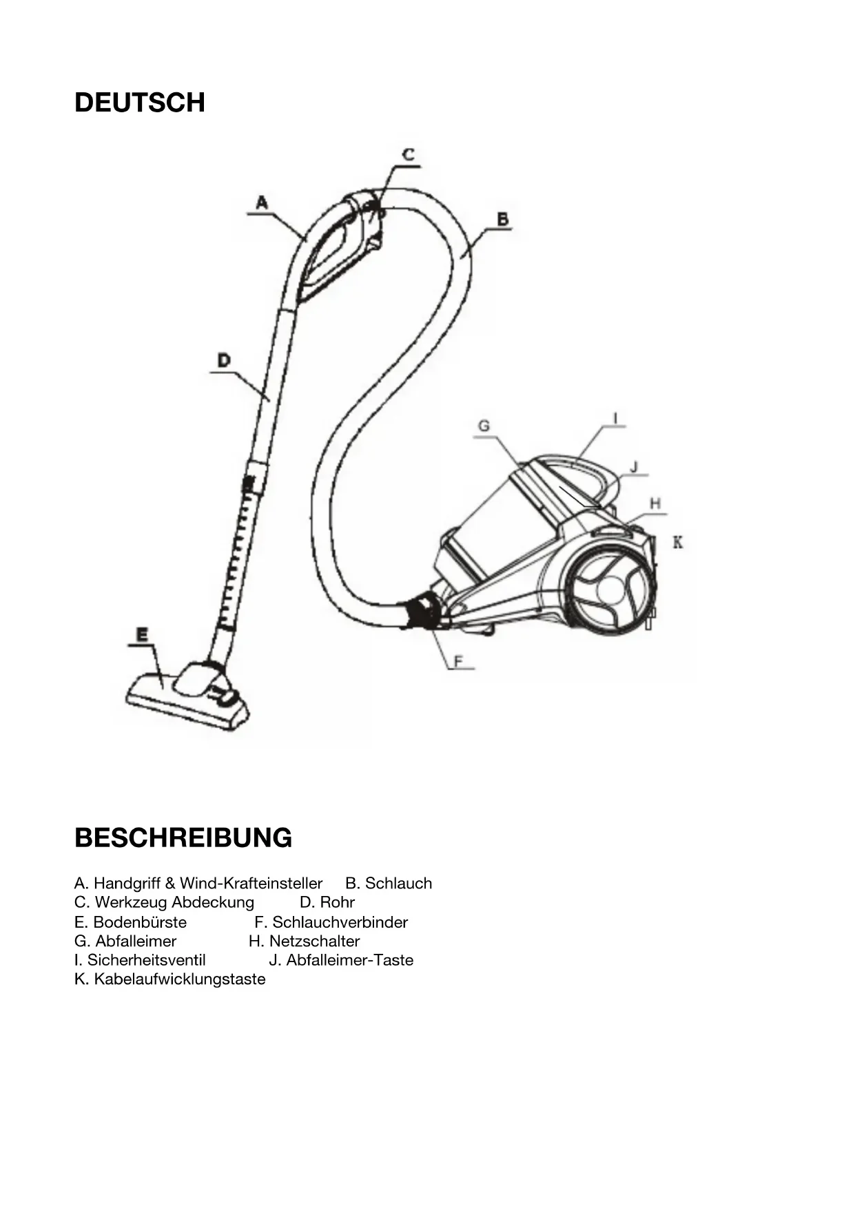 BESCHREIBUNG A. Handgriff & Wind-Krafteinsteller B. Schlauch C. Werkzeug Abdeckung D. Rohr E. Bodenbürste F. Schlauchverbinder G. Abfalleimer H. Netzschalter