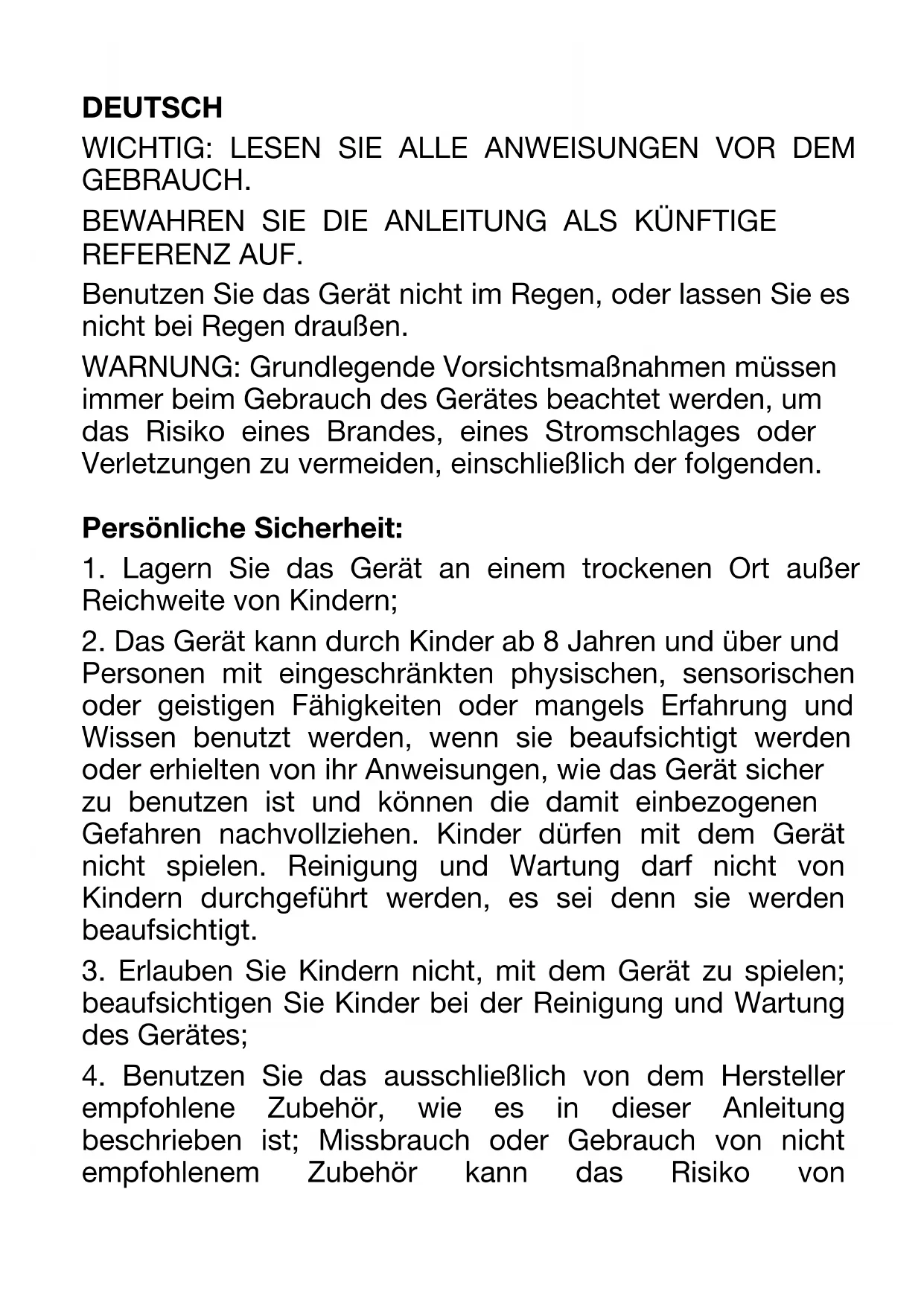 Personen mit eingeschränkten physischen, sensorischen oder geistigen Fähigkeiten oder mangels Erfahrung und Wissen benutzt werden, wenn sie beaufsichtigt werden oder erhielten von ihr Anweisungen, wie das Gerät sicher zu benutzen ist und können die damit einbezogenen Gefahren nachvollziehen. Kinder dürfen mit dem Gerät nicht spielen. Reinigung und Wartung darf nicht von Kindern durchgeführt werden, es sei denn sie werden beaufsichtigt.
