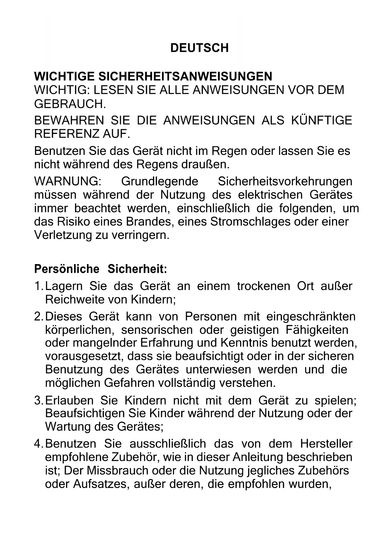 Benutzen Sie ausschließlich das von dem Hersteller empfohlene Zubehör, wie in dieser Anleitung beschrieben ist; Der Missbrauch oder die Nutzung jegliches Zubehörs oder Aufsatzes, außer deren, die empfohlen wurden,kann das Risiko einer Körperverletzung darstellen;