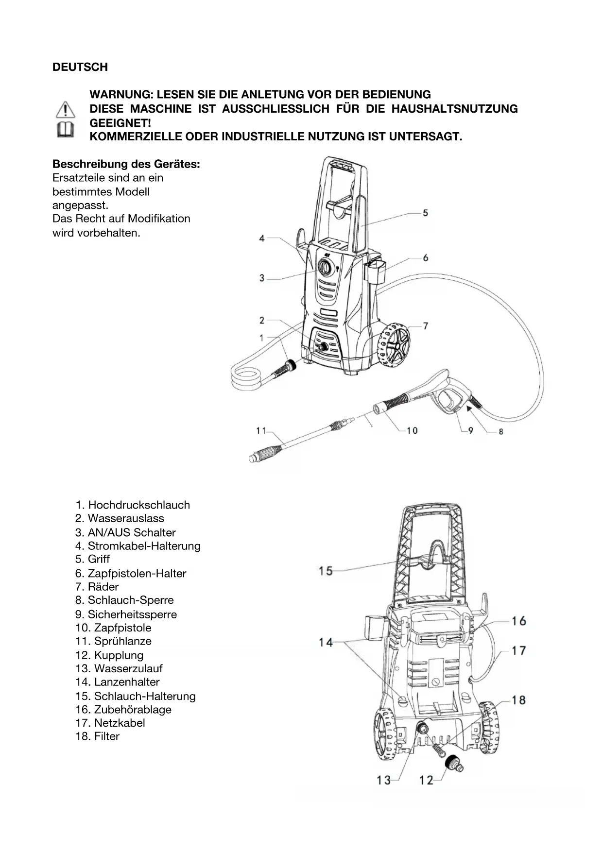 Niedriger druckLiebe Kunden, benutzen Sie den Hochdruckreiniger NICHT, bevor Sie dieses Handbuch gelesen haben! Allgemeine Anweisungen Dieser Hochdruckreiniger ist ausschließlich für die Haushaltsnutzung geeignet: