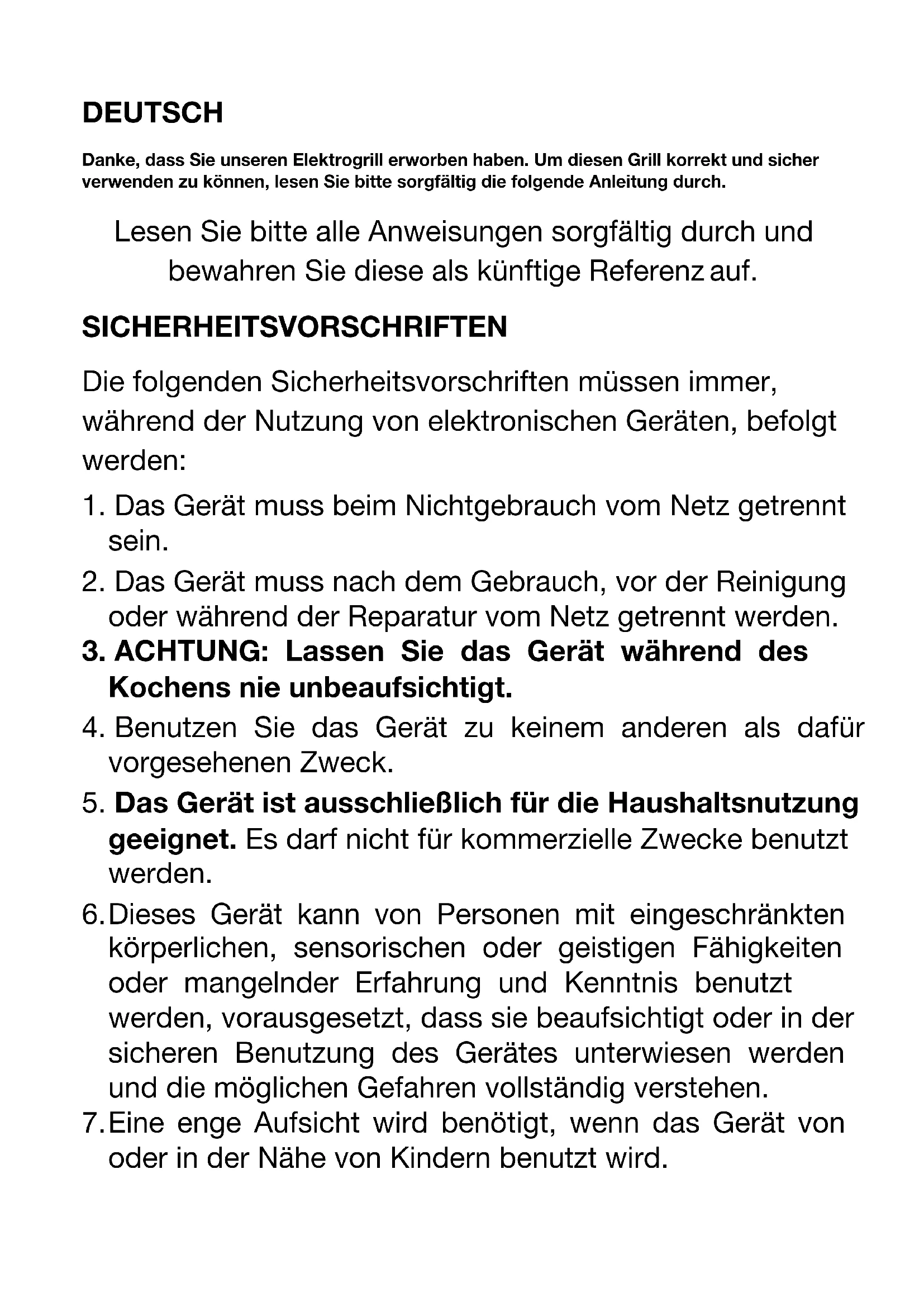 5. Das Gerät ist ausschließlich für die Haushaltsnutzung