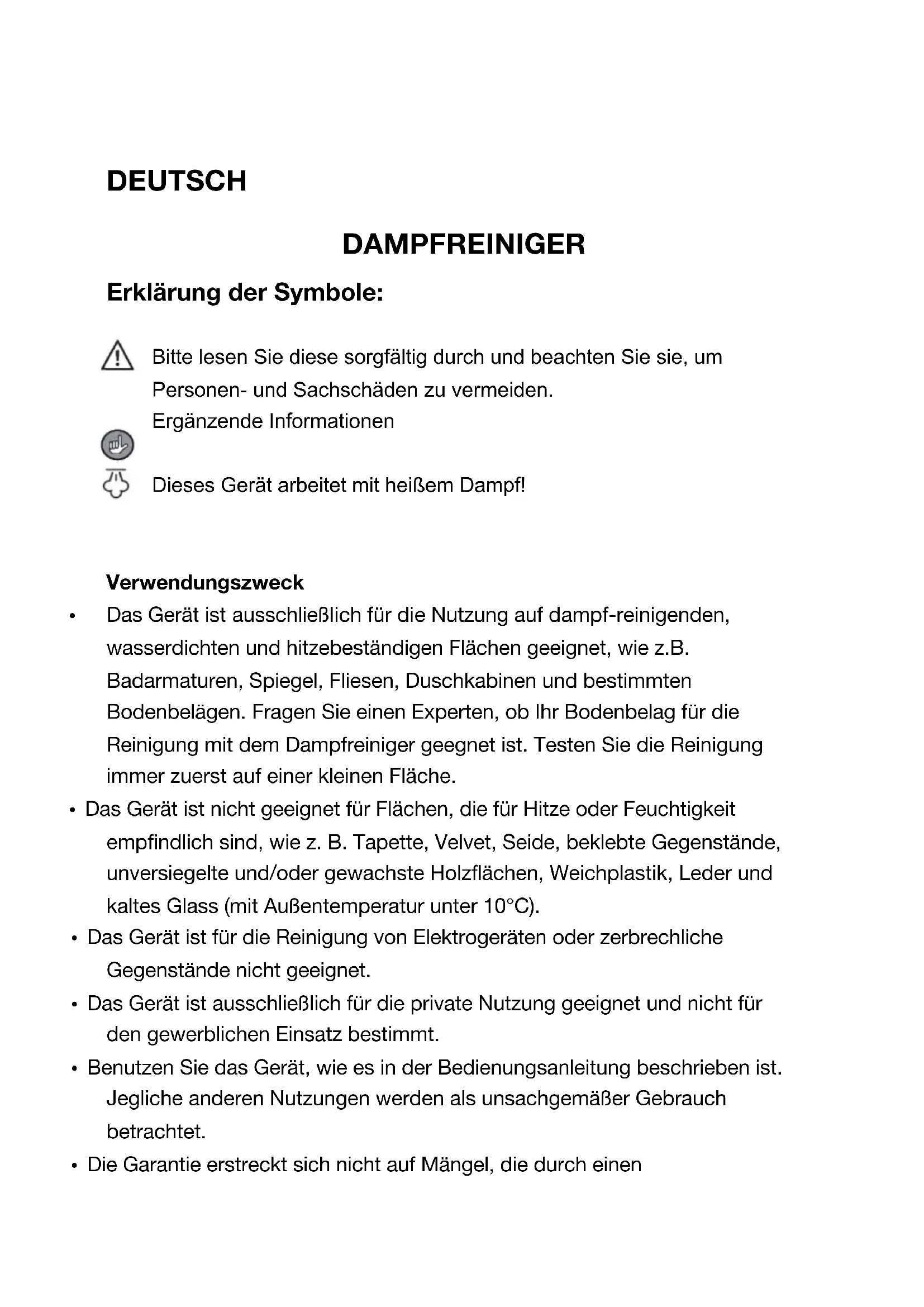 - Das Gerät ist ausschließlich für die Nutzung auf dampf-reinigenden, wasserdichten und hitzebeständigen Flächen geeignet, wie z.B. Badarmaturen, Spiegel, Fliesen, Duschkabinen und bestimmten Bodenbelägen. Fragen Sie einen Experten, ob Ihr Bodenbelag für die Reinigung mit dem Dampfreiniger geegnet ist. Testen Sie die Reinigung immer zuerst auf einer kleinen Fläche.