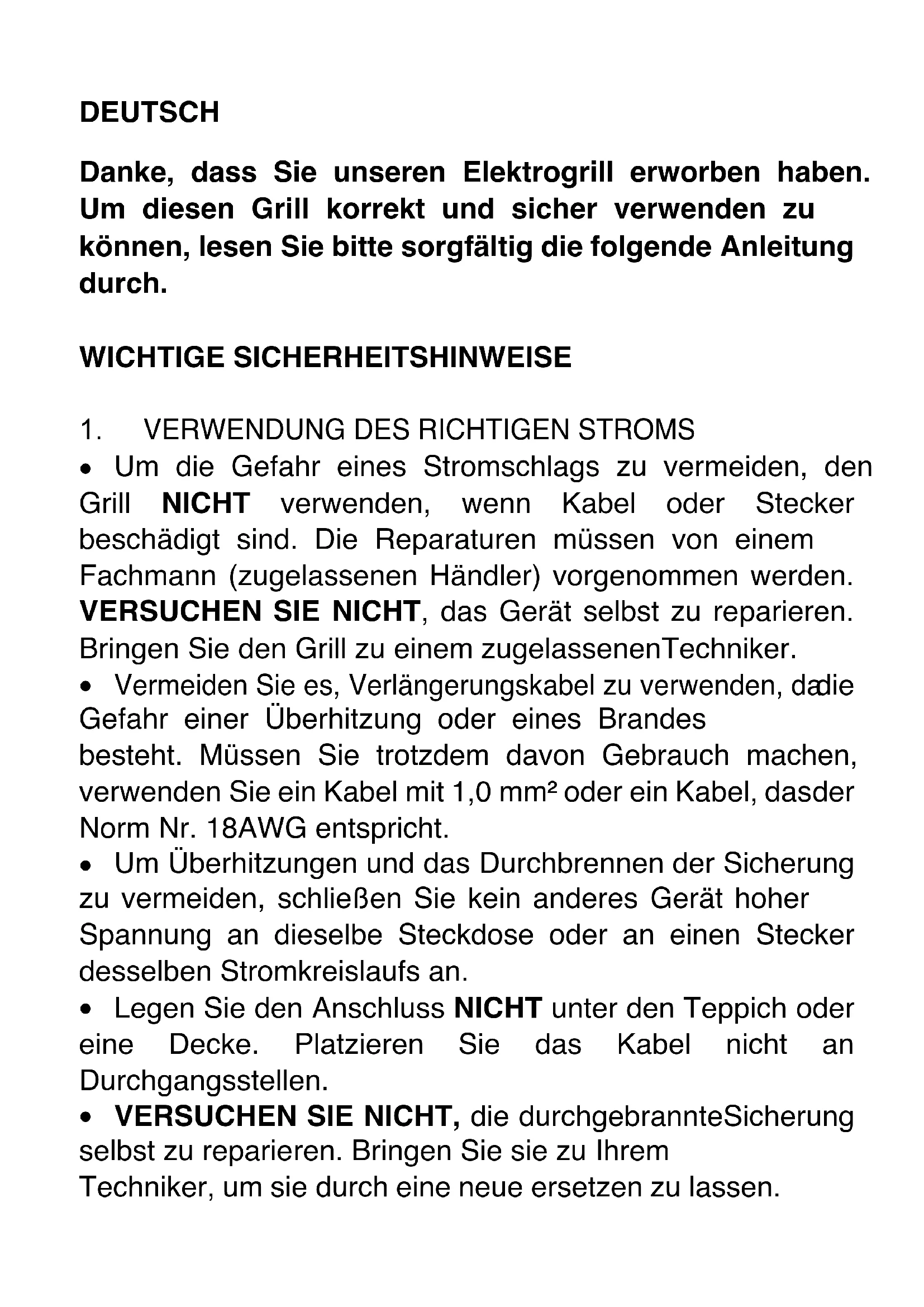Adeva SAS / H.Koenig Europe - 8 rue Marc Seguin - 77290 Mitry Mory - France www.hkoenig.com - sav@hkoenig.com - contact@hkoenig.com - Tél: +33 1 64 67 00 05DEUTSCH Danke, dass Sie unseren Elektrogrill erworben haben. Um diesen Grill korrekt und sicher verwenden zu können, lesen Sie bitte sorgfältig die folgende Anleitung durch. WICHTIGE SICHERHEITSHINWEISE