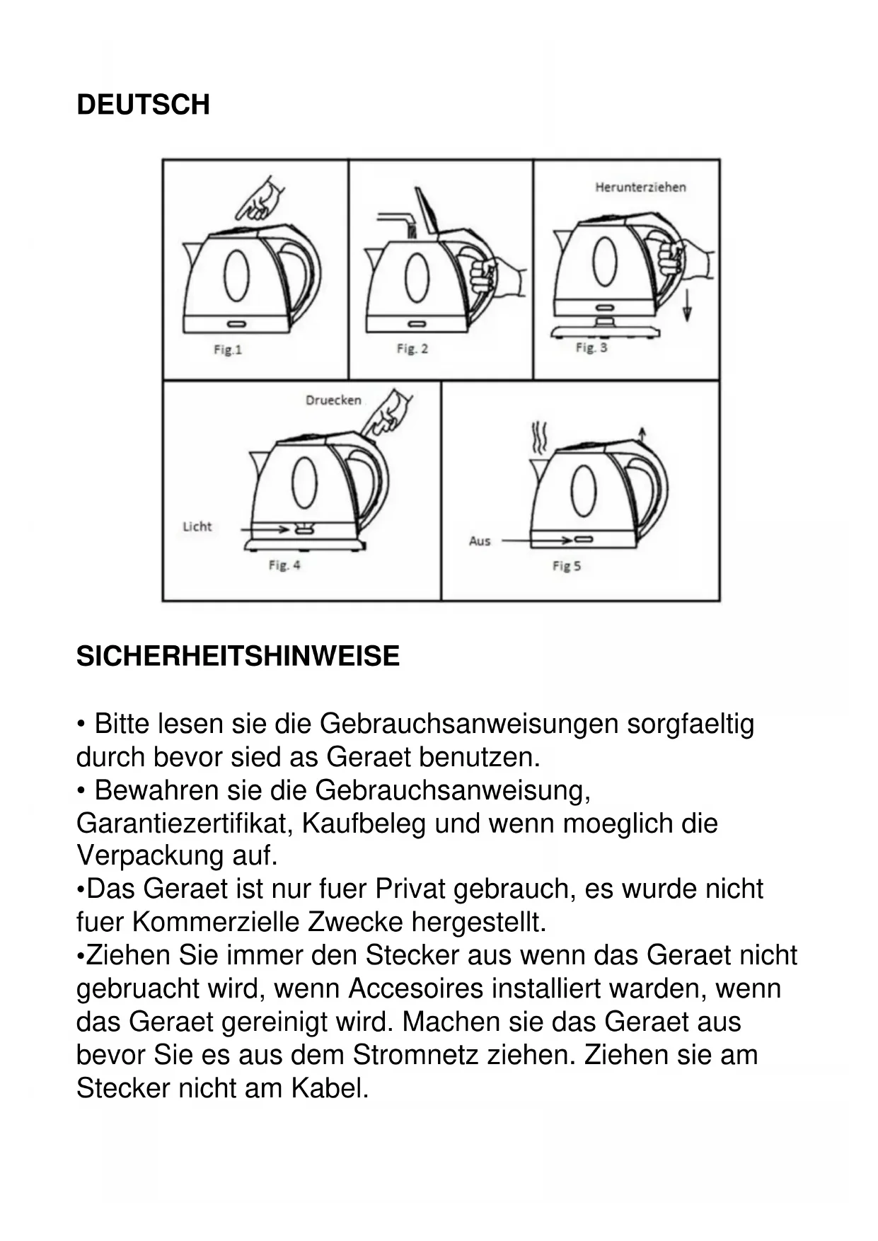 Verwenden Sie den Wasserkocher nicht zum Erhitzen anderer Flüssigkeiten als Wasser, da dies das Gerät beschädigen kann.SPEZIELLE SICHERHEITSHINWEISE