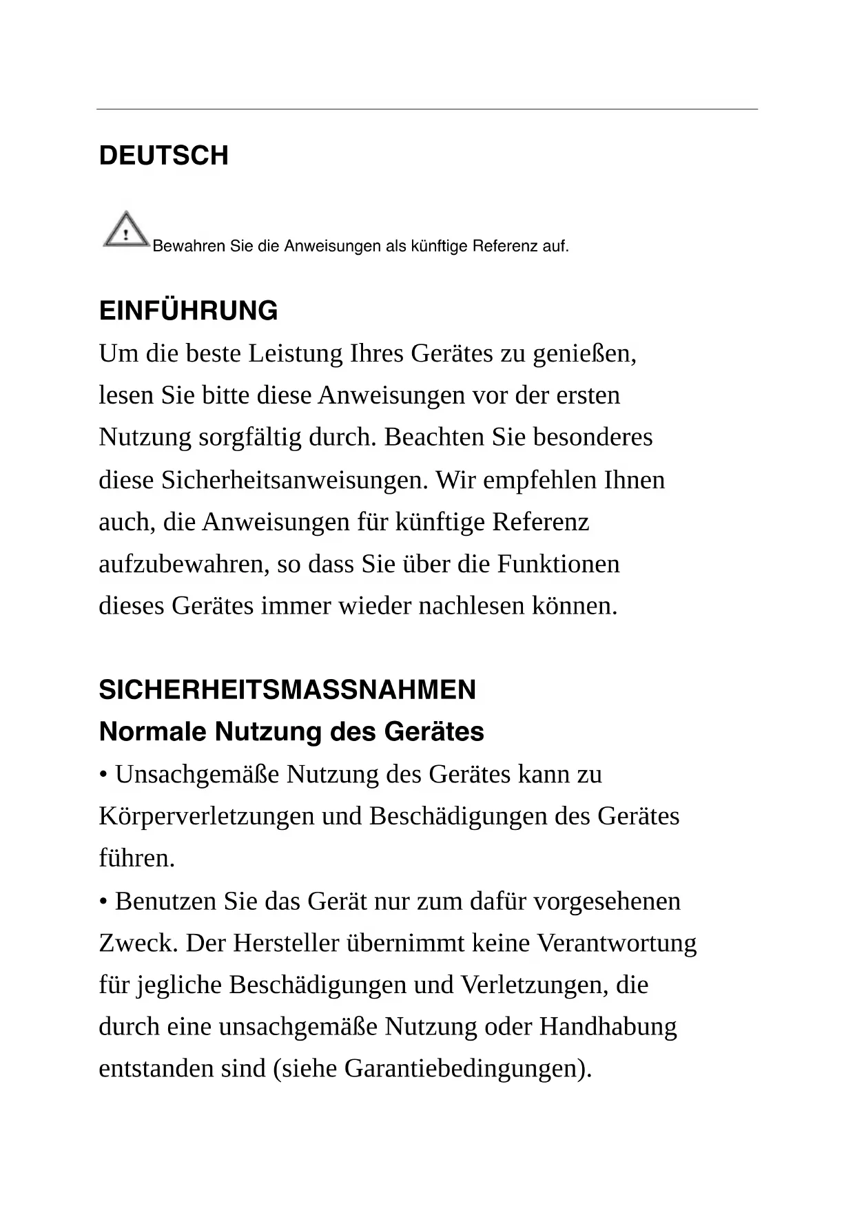 - Benutzen Sie das Gerät nur zum dafür vorgesehenen Zweck. Der Hersteller übernimmt keine Verantwortung für jegliche Beschädigungen und Verletzungen, die durch eine unsachgemäße Nutzung oder Handhabung entstanden sind (siehe Garantiebedingungen).• Benutzen Sie kein Zubehör außer dem, das von dem Hersteller empfohlen wurde.