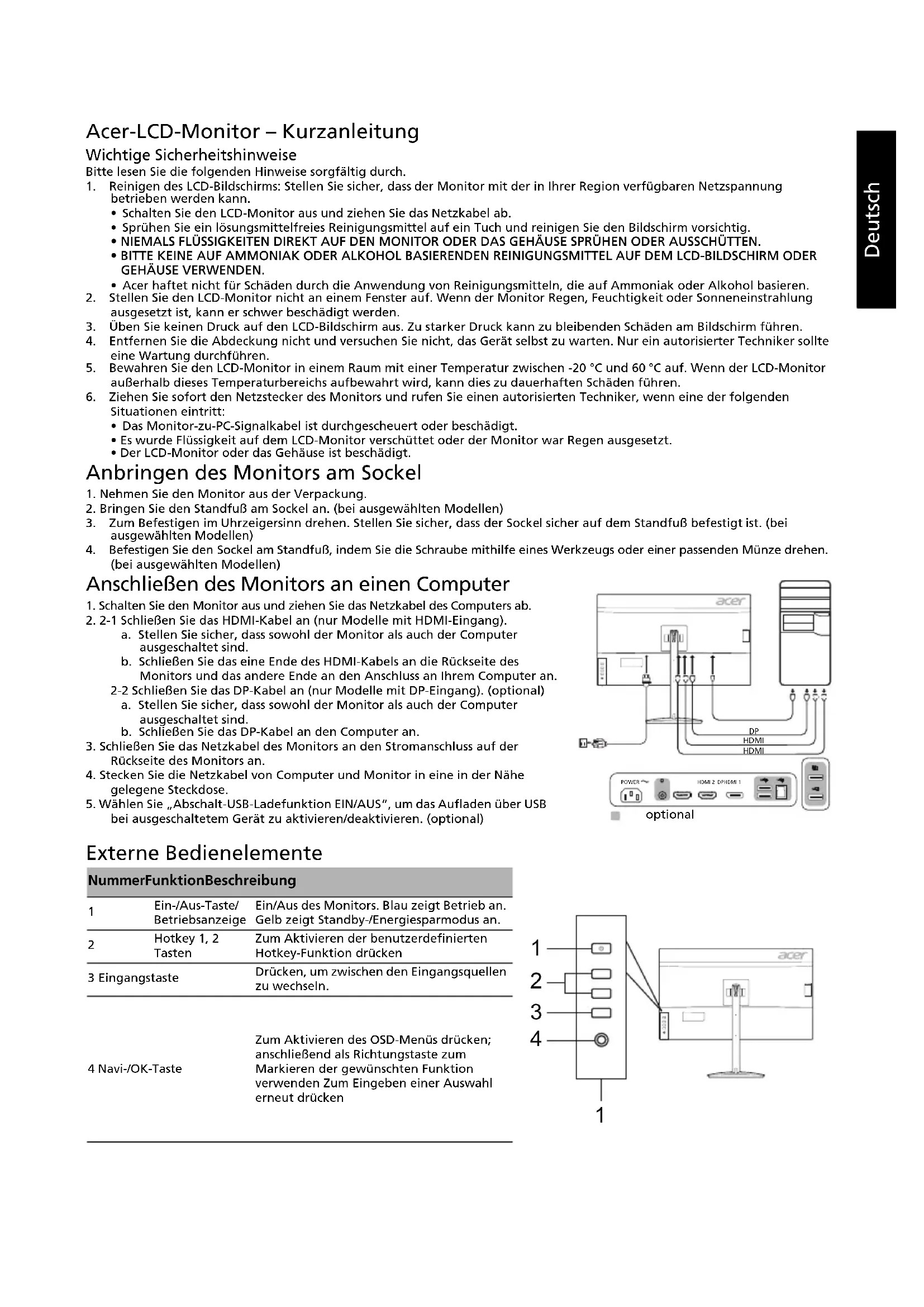 *Jährlicher Energieverbrauch 86 (kWh) (für Modelle mit HDMI-Eingang) Stromverbrauch (bei 200 cd/m²) Eingeschaltet 45 W (typisch) Ruhemodus 0,45 W (typisch) Ausgeschaltet 0,3 W (typisch) Eingangsbuchse HDMI (nur Modelle mit HDMI-Eingang) / DP (nur Modelle mit DP-Eingang) Eingangsvideosignal HDMI (nur Modelle mit HDMI-Eingang) (optional) / DP (nur Modelle mit DP-Eingang) (optional) Lautsprecher 2 W x 2 (nur Modelle mit Audioeingang) (optional) USB USB 3.0 x 4 (optional) Maximale Bildschirmgröße Horizontal: 708,4 mm Vertikal: 398,5 mm Stromquelle 100-240 V, 50/60 Hz Umgebungsbedingungen Betriebstemperatur: 0 bis 40 °C Lagertemperatur: -20 bis 60 °C Luftfeuchtigkeit bei Betrieb: 20 % bis 80 % Abmessungen 727,48 (B) x 479,18 bis 609,18 (H) x 269 (T) mm Gewicht (netto) 9,5 kg (netto) Daten zur Mechanik Neigung: -5° bis +35° (nur am höchsten Punkt können 35 Grad Rückwärtsneigung des Höhenwinkels erzielt werden) Schwenken: 360° Höheneinstellung: 0 mm bis 130 mm Drehgelenk: Nein Abnehmbarer Standfuß: Ja Externe Bedienelemente Schalter/Tasten Ein-/Aus-Taste Hotkey 1 Hotkey 2 Eingang Menü/Navi/OK Funktionen Helligkeit Kontrast Blaues Licht Schwarzverst. ACM HDR*** Superscharf Gamma Farbtemp. Modi Farbraum Grauskala-Modus 6-Achs.-Farbton 6-Achs.-Sättig, Lautstärke Stumm Overdrive FreeSync Premium** Akt.-Freq.-Nr. Extrem geringe Latenz Zielpunkt Sprache OSD-Dauer Transparenz OSD-Sperre Eingang Auto-Quelle DP-Format Schnelltastenzuweisung Bildformate PIP/PBP DDC/CI HDMI-Schwarzp. Schnellstartmod. Übertaktung# Abschalt-USB-Ladefunktion Displayinformationen Alle Einst. rücksetzen Beenden Die genaue technische Ausstattung ist je nach Modell und/oder Region unterschiedlich.Español Guía de inicio rápido del monitor LCD de Acer Instrucciones de seguridad importantes Lea detenidamente las siguientes instrucciones. 1. Para limpiar la pantalla del monitor LCD: Asegúrese de que los parámetros eléctricos del monitor permiten utilizarlo con la corriente de CA disponible en su ubicación.• Apague el monitor LCD y desconecte el cable de alimentación.