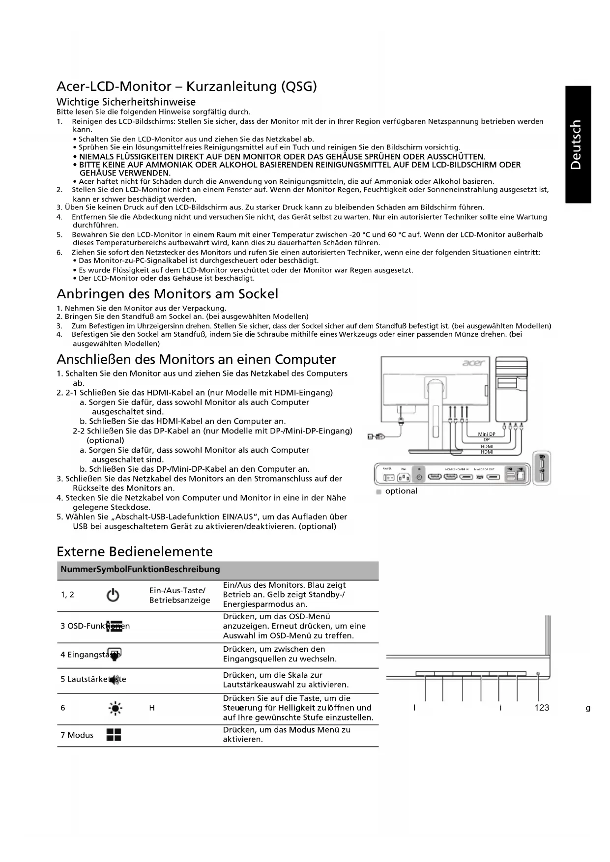 Mini DPPOWERHDMI 2 HDMI 1 DP INMini DP DP OUT optional 1234567Deutsch Vorschriften und Sicherheitshinweise FCC-Hinweis Dieses Gerät wurde getestet und erfüllt die Grenzwerte für ein digitales Gerät der Klasse B gemäß Teil 15 der FCC-Vorschriften. Diese Grenzwerte sollen einen angemessenen Schutz gegen Interferenzen bei der Installation in einem Wohngebiet bieten. Dieses Gerät erzeugt, verwendet und gibt möglicherweise Funkfrequenzenergie ab und kann, wenn es nicht gemäß den Anweisungen installiert und verwendet wird, Störungen des Funkverkehrs verursachen. Es gibt jedoch keine Garantie dafür, dass bei einer bestimmten Installation keine Störungen auftreten. Wenn dieses Gerät Störungen des Radio- oder Fernsehempfangs verursacht, was sich durch Aus- und Einschalten des Geräts feststellen lässt, kann der Benutzer versuchen, die Störungen durch eine oder mehrere der folgenden Maßnahmen zu beseitigen: Neuausrichtung oder Versetzen der Empfangsantenne Vergrößern des Abstands zwischen dem Gerät und dem Receiver Anschließen des Geräts an eine Steckdose eines anderen Stromkreises als den, an dem der Receiver angeschlossen ist Zu Rate ziehen des Händlers oder eines erfahrenen Radio-/Fernsehtechnikers CE-Konformitätserklärung Acer Inc. erklärt hiermit, dass dieser LCD-Monitor den grundlegenden Anforderungen und anderen relevanten Bestimmungen der EMV-Richtlinie 2014/30/EU, der Niederspannungsrichtlinie 2014/35/EU und der RoHS-Richtlinie 2011/65/EU sowie der Richtlinie 2009/125/EG zur Schaffung eines Rahmens für die Festlegung von Anforderungen an die umweltgerechte Gestaltung energieverbrauchsrelevanter Produkte entspricht. Hinweis: Heben Sie den Monitor nicht an der Unterseite an, um Schäden am Monitor zu vermeiden. Hinweis: Abgeschirmte Kabel Alle Verbindungen zu anderen Computing-Geräten müssen über abgeschirmte Kabel erfolgen, um die Einhaltung der EMV-Richtlinien sicherzustellen. Hinweis: Peripheriegeräte Nur Peripheriegeräte (Eingabe-/Ausgabegeräte, Terminals, Drucker usw.), die die Grenzwerte der Klasse B erfüllen, dürfen an dieses Gerät angeschlossen werden. Der Anschluss von Peripheriegeräten, die diese Grenzwerte nicht erfüllen, kann Störungen des Radio- und Fernsehempfangs hervorrufen. Vorsicht Änderungen oder Modifikationen, die nicht ausdrücklich durch den Hersteller genehmigt wurden, können dazu führen, dass die Betriebserlaubnis, die dem Benutzer von der Federal Communications Commission für dieses Produkt erteilt wurde, erlischt. Betriebsbedingungen Dieses Gerät entspricht Teil 15 der FCC-Vorschriften. Der Betrieb unterliegt folgenden zwei Bedingungen: (1) Dieses Gerät darf keine schädlichen Interferenzen verursachen und (2) dieses Gerät muss alle empfangenen Interferenzen annehmen, einschließlich Interferenzen, die zu einem unerwünschten Betrieb führen können. Hinweis: Benutzer in Kanada Dieses digitale Gerät der Klasse B entspricht der kanadischen Norm ICES-003. Remarque à l'intention des utilisateurs canadiens Cet appareil numérique de la classe B est conforme à la norme NMB-003 du Canada. Entsorgung von Elektrogeräten durch Benutzer in Privathaushalten in der EU Dieses Symbol auf dem Produkt oder seiner Verpackung weist darauf hin, dass dieses Produkt nicht über den normalen Hausmüll entsorgt werden darf. Es liegt in Ihrer Verantwortung, Ihre Altgeräte zur Entsorgung an einer Rücknahmestelle für das Recycling und die Entsorgung von elektrischen und elektronischen Geräten abzugeben. Die getrennte Sammlung und das Recycling von Altgeräten nach Ablauf der Lebensdauer tragen zur Erhaltung der natürlichen Ressourcen bei und garantieren eine Wiederverwertung, die die Gesundheit der Menschen und die Umwelt schont. Weitere Informationen dazu, wo sich Rücknahmestellen für Ihre Altgeräte befinden, erhalten Sie bei Ihrer Stadtverwaltung, den örtlichen Müllentsorgungsbetrieben oder im Geschäft, in dem Sie das Produkt erworben haben. Warnung zu Magneten Bestimmte elektronische Geräte, wie z.B. Festplatten, USB-Geräte, Tablet-PCs, Notebooks, Handys, Uhren, Kopfhörer, Lautsprecher, Kreditkarten, Magnetkarten usw., reagieren empfindlich auf magnetische Felder und können dauerhaft geschädigt oder vorübergehend deaktiviert werden, wenn sie einem zu starken Magnetfeld ausgesetzt sind. Elektronische Geräte sollten nicht in der Nähe von oder direkt auf dem magnetischen Bereich des Standfußes abgelegt werden. MagnetDeutsch TECHNISCHE DATEN Handbücher und andere Dokumente für Ihr Acer-Produkt finden Sie auf der offiziellen Acer-Support-Website. *Der jährliche Energieverbrauch berechnet sich anhand des typischen Stromverbrauchs von 4 Stunden pro Tag, 365 Tage im Jahr. LCD-Bildschirm System TFT-LCD-Farbbildschirm Größe 27”W (69 cm) Pixelabstand 0,233 mm (H) x 0,233 mm (V) Helligkeit 350 cd/m