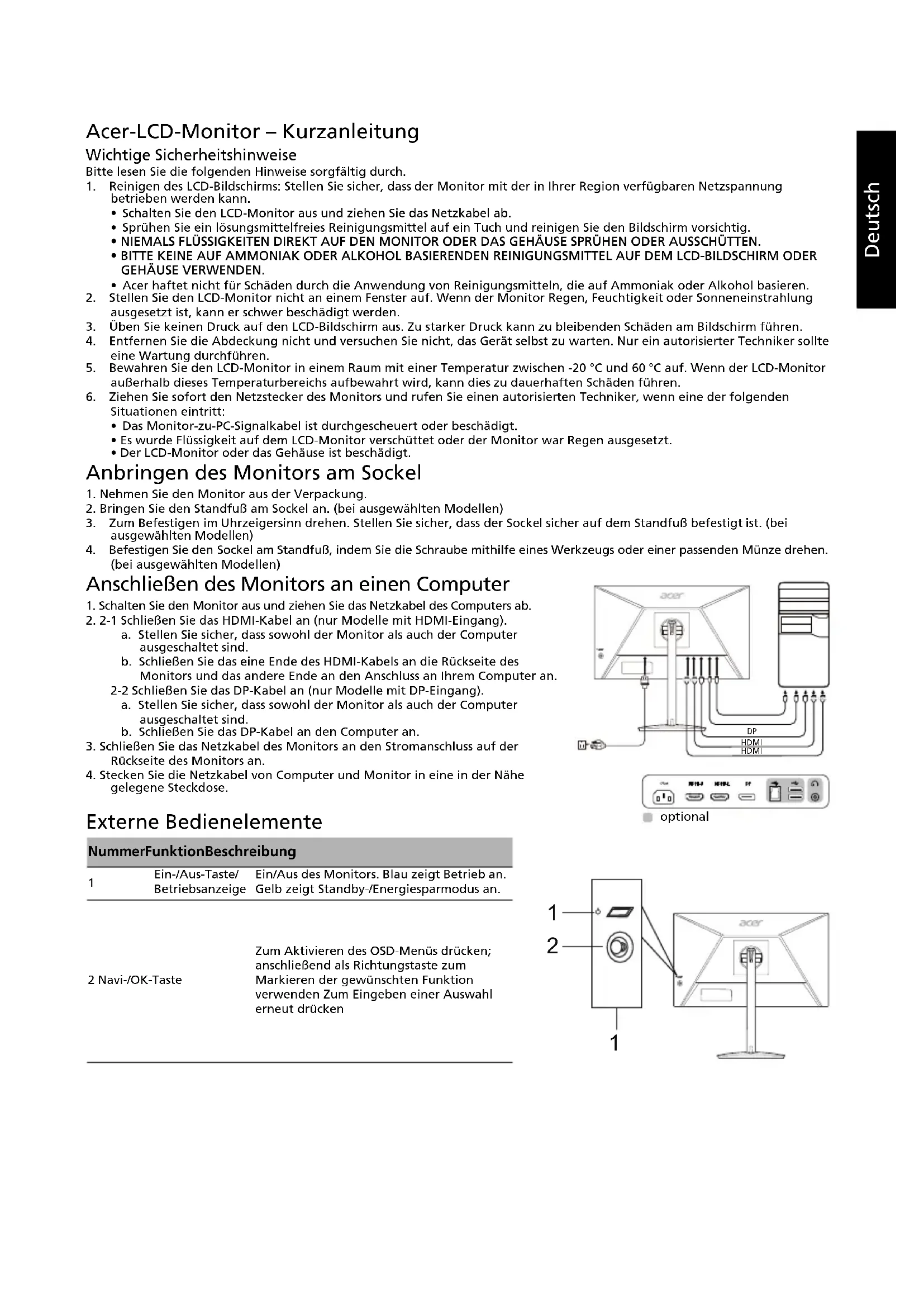 3. Zum Befestigen im Uhrzeigersinn drehen. Stellen Sie sicher, dass der Sockel sicher auf dem Standfuß befestigt ist. (bei ausgewählten Modellen) 4. Befestigen Sie den Sockel am Standfuß, indem Sie die Schraube mithilfe eines Werkzeugs oder einer passenden Münze drehen. (bei ausgewählten Modellen) Anschließen des Monitors an einen Computer 1. Schalten Sie den Monitor aus und ziehen Sie das Netzkabel des Computers ab.2. 2-1 Schließen Sie das HDMI-Kabel an (nur Modelle mit HDMI-Eingang).a. Stellen Sie sicher, dass sowohl der Monitor als auch der Computer ausgeschaltet sind. b. Schließen Sie das eine Ende des HDMI-Kabels an die Rückseite des Monitors und das andere Ende an den Anschluss an Ihrem Computer an.2-2 Schließen Sie das DP-Kabel an (nur Modelle mit DP-Eingang).a. Stellen Sie sicher, dass sowohl der Monitor als auch der Computer ausgeschaltet sind.b. Schließen Sie das DP-Kabel an den Computer an.3. Schließen Sie das Netzkabel des Monitors an den Stromanschluss auf der Rückseite des Monitors an.4. Stecken Sie die Netzkabel von Computer und Monitor in eine in der Nähe gelegene Steckdose. Externe Bedienelemente Nummer Funktion Beschreibung