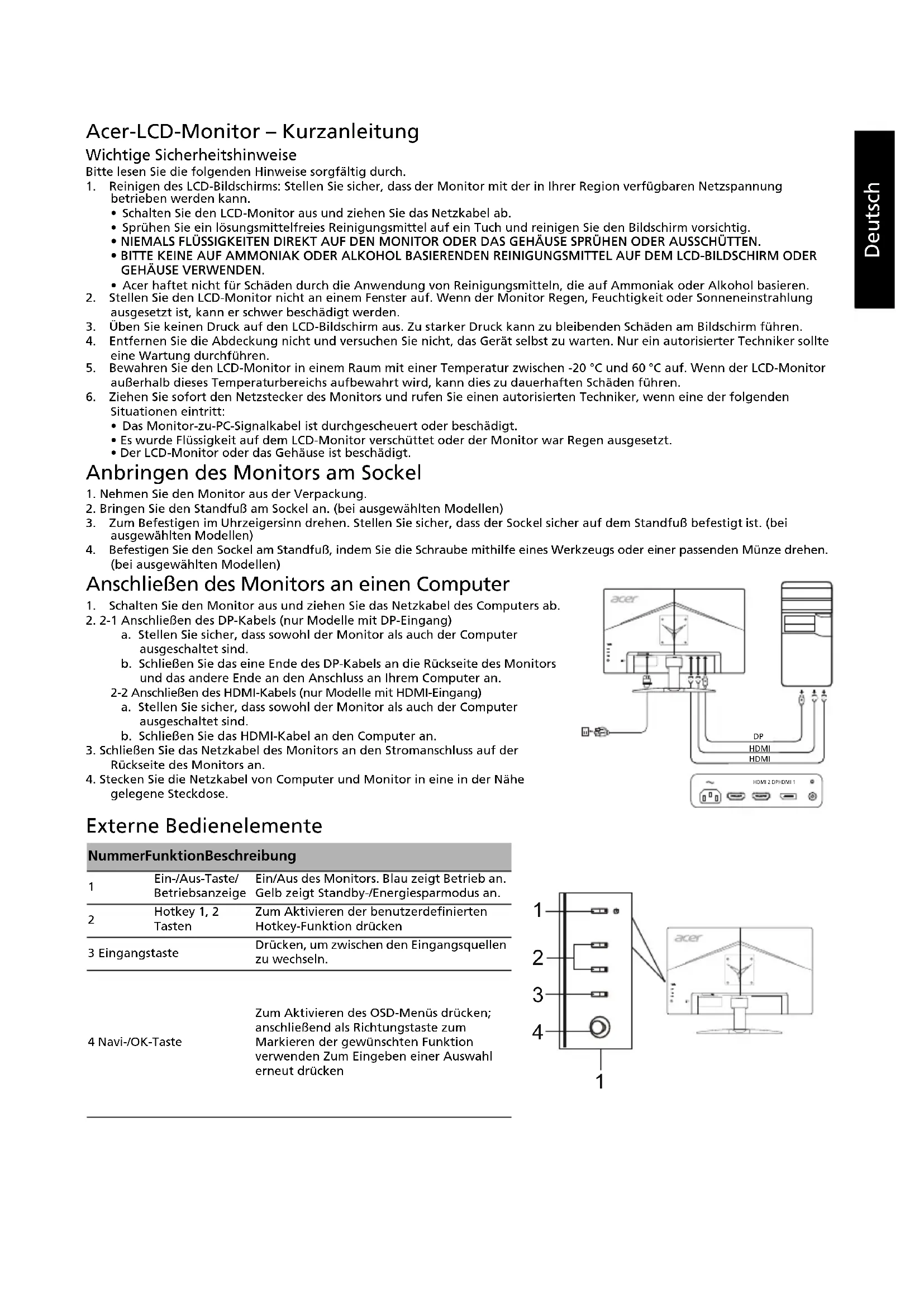 (typisch) Kontrast 100000000:1 Max. (ACM) Einsehbarer Winkel 178° (H) 178° (V) (CR = 10) Reaktionszeit 1 ms (VRB) Bildschirmtyp In-Plane-Switching H-Frequenz HDMI: 30 - 112 KHz DP: 112 - 112 KHz V-Frequenz HDMI: 56 - 76 Hz DP: 48 - 75 Hz Displayfarben 16,7 Millionen Pixelfrequenz 298,47 MHz Maximale Auflösung 2560 x 1440 @ 75 Hz Plug & Play VESA DDCCI/DDC2B Stromverbrauch (bei 200 cd/m²) Eingeschaltet 24 W (typisch) Ruhemodus 0,35 W (typisch) Ausgeschaltet 0,3 W (typisch) Eingangsbuchse HDMI (nur Modelle mit HDMI-Eingang) DP (nur Modelle mit DP-Eingang) Eingangsvideosignal HDMI (nur Modelle mit HDMI-Eingang) (optional) DP (nur Modelle mit DP-Eingang) (optional) Lautsprecher 2 W x 2 (optional) Maximale Bildschirmgröße Horizontal: 596,74 mm Vertikal: 335,66 mm Stromquelle 100 - 240 V, 50/60 Hz Umgebungsbedingungen Betriebstemperatur: 0 bis 40 °C Lagertemperatur: -20 bis 60 °C Luftfeuchtigkeit bei Betrieb: 20 % bis 80 % Abmessungen 614 (B) x 454,02 (H) x 231,08 (T) mm Gewicht (netto) 5,06 kg (netto) Daten zur Mechanik Neigung: -5° bis +15° Schwenken: Nein Höheneinstellung: Nein Drehgelenk: Nein Abnehmbarer Standfuß: Ja Externe Bedienelemente Schalter/Tasten Ein-/Aus-Taste Hotkey 1 Hotkey 2 Eingang Menü/Navi/OK Funktionen Helligkeit Kontrast Blaues Licht Schwarzverst. ACM Ein/Aus Superscharf Gamma Farbtemp. Modi sRGB Grauskala-Modus 6-Achs.-Farbton 6-Achs.-Sättig, Lautstärke Stumm Overdrive FreeSync VRB Zielpunkt Sprache OSD-Dauer Transparenz Akt.-Freq.-Nr. OSD-Sperre Eingang Auto-Quelle DP-Format Schnelltastenzuweisung Bildformate DDC/CI Ein/Aus HDMI-Schwarzp. Schnellstartmod. Displayinformationen Alle Einst. rücksetzen Beenden Die genaue technische Ausstattung ist je nach Modell und/oder Region unterschiedlich.Español Guía de inicio rápido del monitor LCD de Acer Instrucciones de seguridad importantes Lea detenidamente las siguientes instrucciones. 1. Para limpiar la pantalla del monitor LCD: Asegúrese de que los parámetros eléctricos del monitor permiten utilizarlo con la corriente de CA disponible en su ubicación.• Apague el monitor LCD y desconecte el cable de alimentación.