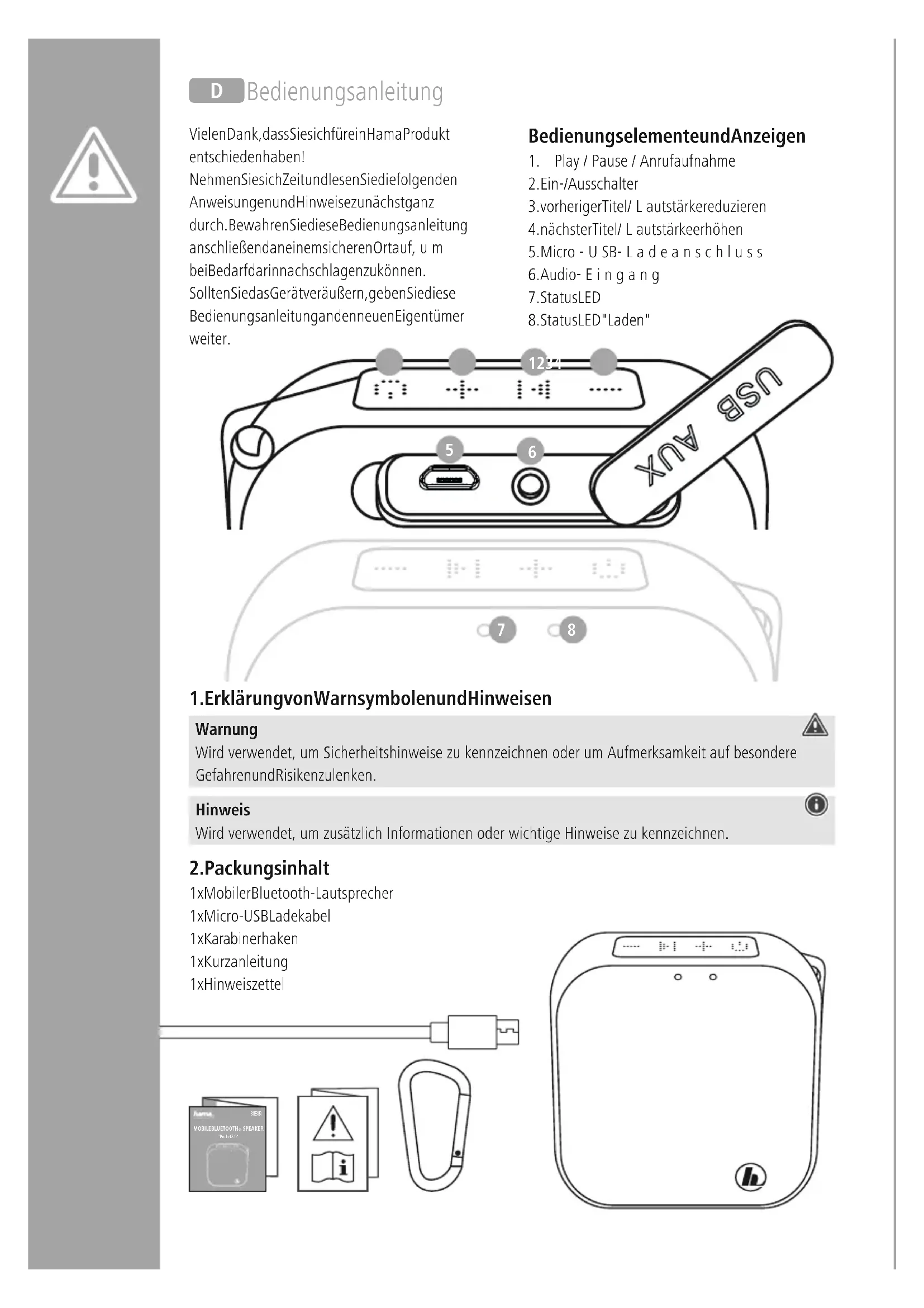 SPEAKER “Pocket 2.0” Vielen Dank, dass Sie sich für ein Hama Produkt entschieden haben! Nehmen Sie sich Zeit und lesen Sie die folgenden Anweisungen und Hinweise zunächst ganz durch. Bewahren Sie diese Bedienungsanleitung anschließend an einem sicheren Ort auf,um bei Bedarf darin nachschlagen zu können. Sollten Sie das Gerät veräußern, geben Sie diese Bedienungsanleitung an den neuen Eigentümer weiter. Bedienungselemente und Anzeigen