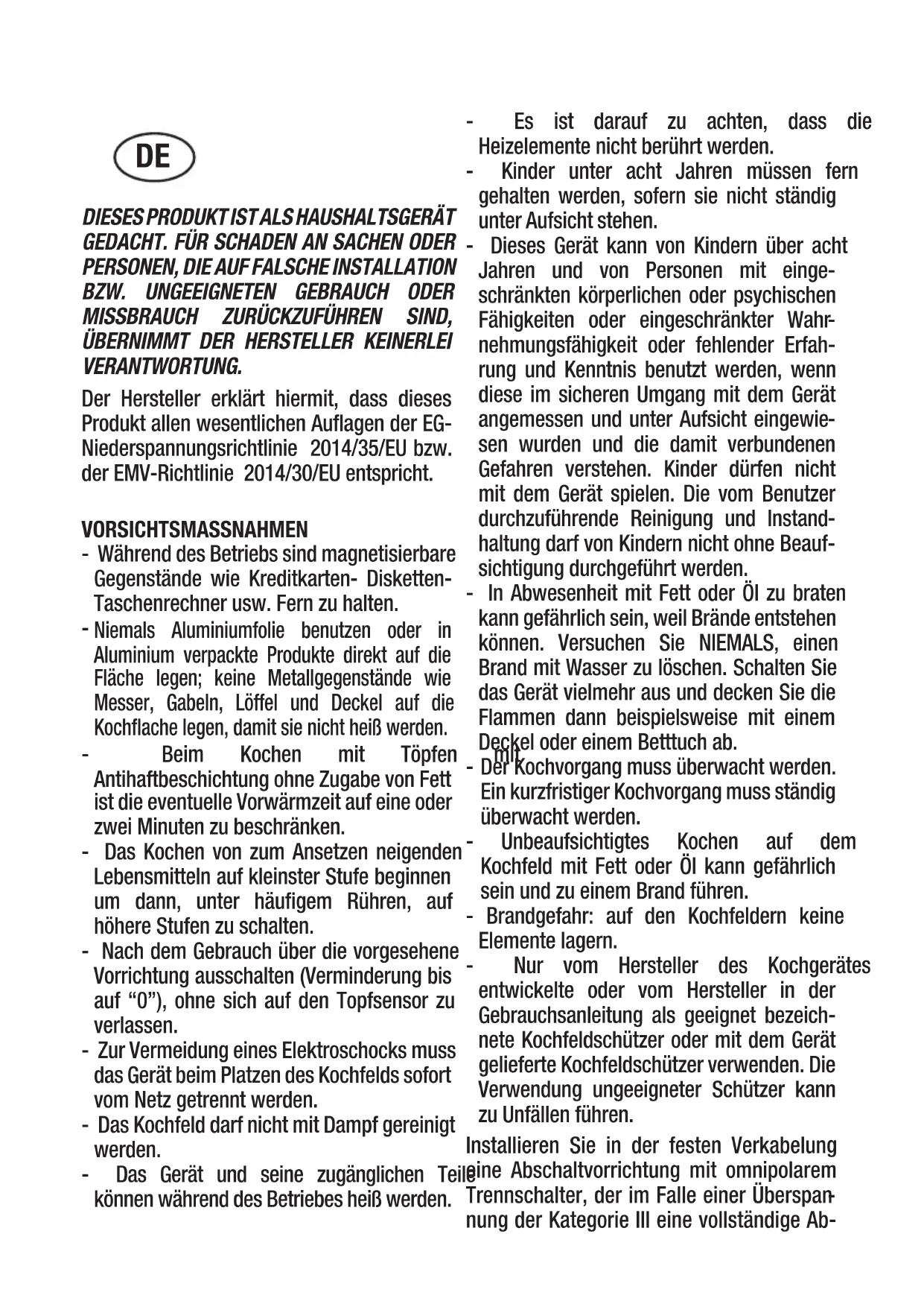 haltung darf von Kindern nicht ohne Beauf- sichtigung durchgeführt werden. - In Abwesenheit mit Fett oder Öl zu braten kann gefährlich sein, weil Brände entstehen können. Versuchen Sie NIEMALS, einen Brand mit Wasser zu löschen. Schalten Sie das Gerät vielmehr aus und decken Sie die Flammen dann beispielsweise mit einem Deckel oder einem Betttuch ab. - Der Kochvorgang muss überwacht werden. Ein kurzfristiger Kochvorgang muss ständig überwacht werden. - Unbeaufsichtigtes Kochen auf dem Kochfeld mit Fett oder Öl kann gefährlich sein und zu einem Brand führen. - Brandgefahr: auf den Kochfeldern keine Elemente lagern. - Nur vom Hersteller des Kochgerätes entwickelte oder vom Hersteller in der Gebrauchsanleitung als geeignet bezeich- nete Kochfeldschützer oder mit dem Gerät gelieferte Kochfeldschützer verwenden. Die Verwendung ungeeigneter Schützer kann zu Unfällen führen. Installieren Sie in der festen Verkabelung eine Abschaltvorrichtung mit omnipolarem Trennschalter, der im Falle einer Überspan