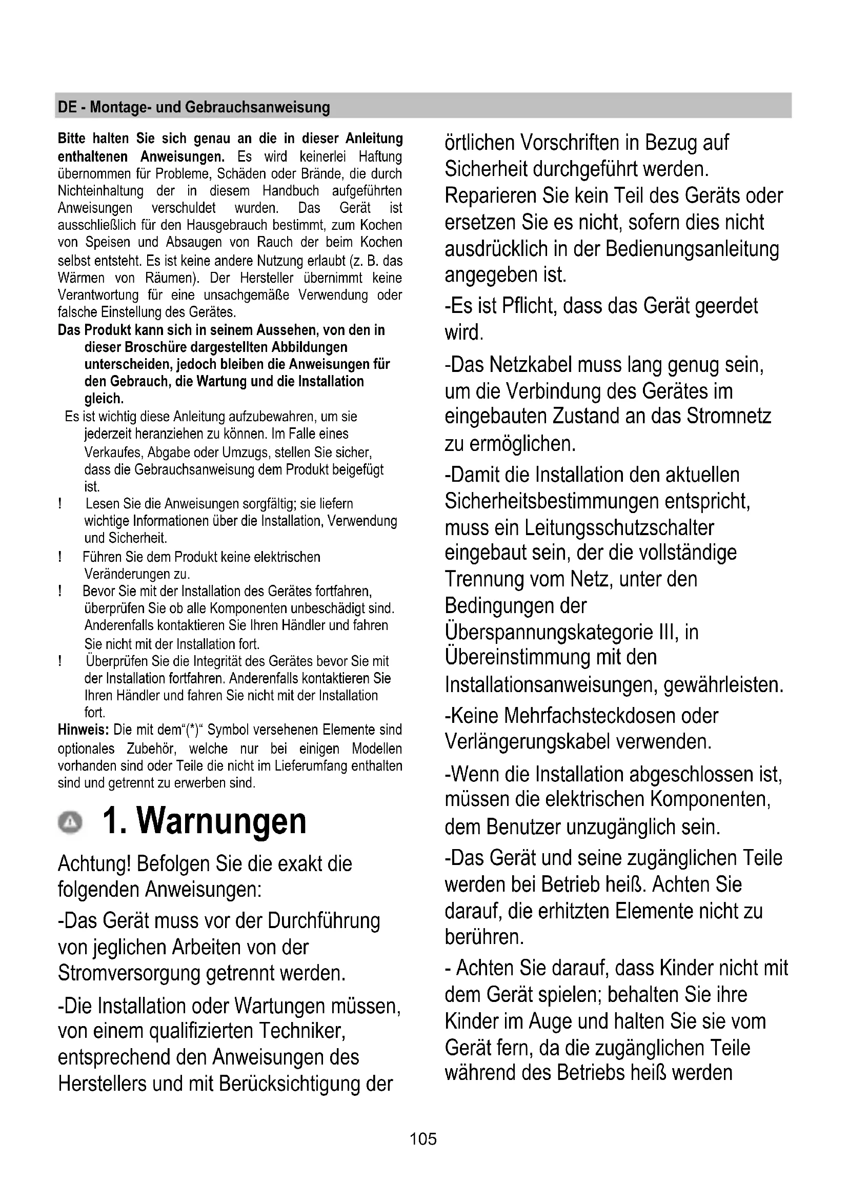 Si le problème persiste après les susdites vérifications, contacter le Service Clientèle le plus proche.105 DE - Montage- und Gebrauchsanweisung Bitte halten Sie sich genau an die in dieser Anleitung enthaltenen Anweisungen. Es wird keinerlei Haftung übernommen für Probleme, Schäden oder Brände, die durch Nichteinhaltung der in diesem Handbuch aufgeführten Anweisungen verschuldet wurden. Das Gerät ist ausschließlich für den Hausgebrauch bestimmt, zum Kochen von Speisen und Absaugen von Rauch der beim Kochen selbst entsteht. Es ist keine andere Nutzung erlaubt (z. B. das Wärmen von Räumen). Der Hersteller übernimmt keine Verantwortung für eine unsachgemäße Verwendung oder falsche Einstellung des Gerätes. Das Produkt kann sich in seinem Aussehen, von den in dieser Broschüre dargestellten Abbildungen unterscheiden, jedoch bleiben die Anweisungen für den Gebrauch, die Wartung und die Installation gleich. Es ist wichtig diese Anleitung aufzubewahren, um sie jederzeit heranziehen zu können. Im Falle eines Verkaufes, Abgabe oder Umzugs, stellen Sie sicher, dass die Gebrauchsanweisung dem Produkt beigefügt ist. ! Lesen Sie die Anweisungen sorgfältig; sie liefern wichtige Informationen über die Installation, Verwendung und Sicherheit. ! Führen Sie dem Produkt keine elektrischen Veränderungen zu. ! Bevor Sie mit der Installation des Gerätes fortfahren, überprüfen Sie ob alle Komponenten unbeschädigt sind. Anderenfalls kontaktieren Sie Ihren Händler und fahren Sie nicht mit der Installation fort. ! Überprüfen Sie die Integrität des Gerätes bevor Sie mit der Installation fortfahren. Anderenfalls kontaktieren Sie Ihren Händler und fahren Sie nicht mit der Installation fort. Hinweis: Die mit dem“(*)“ Symbol versehenen Elemente sind optionales Zubehör, welche nur bei einigen Modellen vorhanden sind oder Teile die nicht im Lieferumfang enthalten sind und getrennt zu erwerben sind.