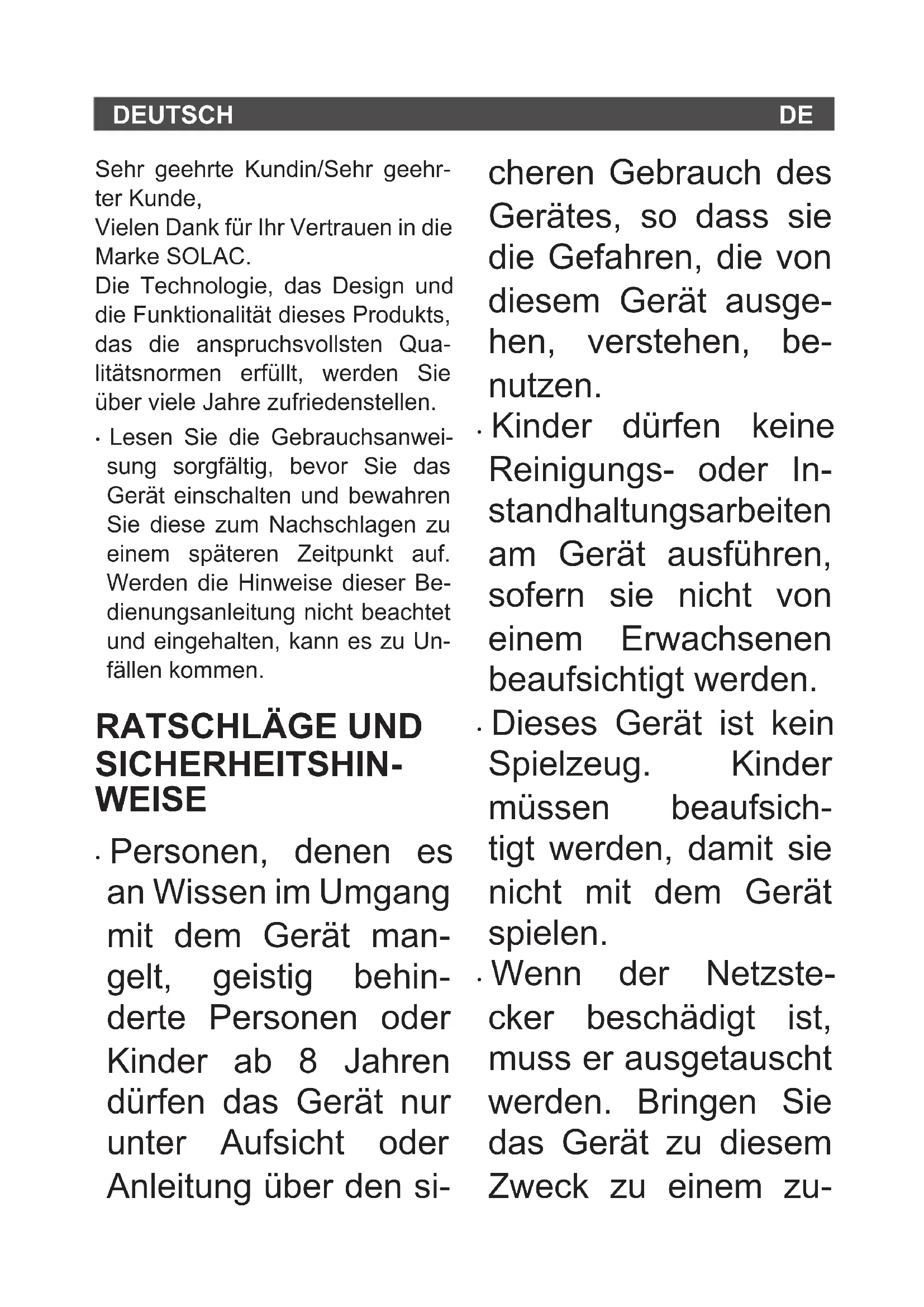 PRODUIT FRDEUTSCH DE Sehr geehrte Kundin/Sehr geehr- ter Kunde, Vielen Dank für Ihr Vertrauen in die Marke SOLAC. Die Technologie, das Design und die Funktionalität dieses Produkts, das die anspruchsvollsten Qua- litätsnormen erfüllt, werden Sie über viele Jahre zufriedenstellen.