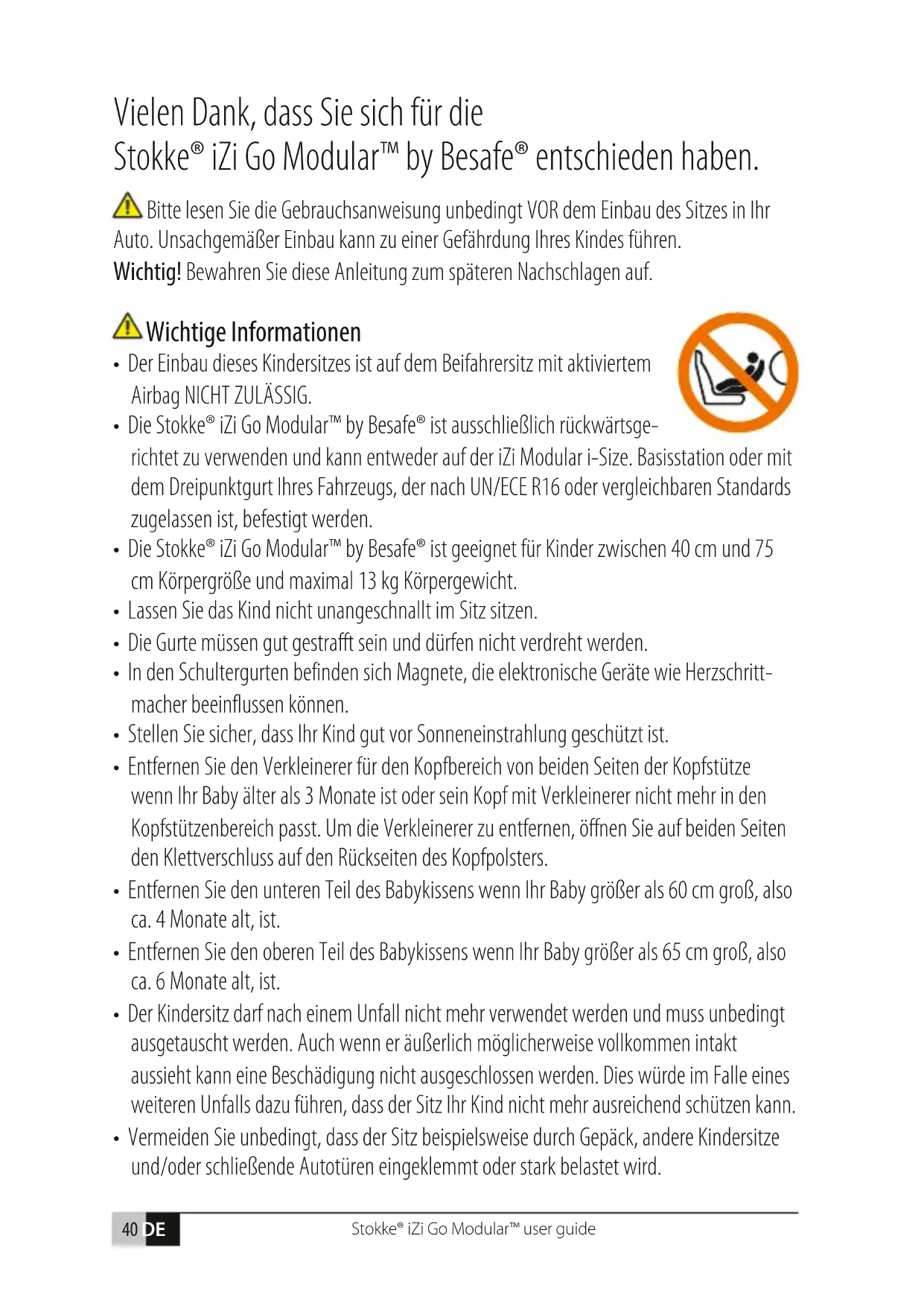 - Záruka platí pouze tehdy, používáte-li vaši sedačku správně a opatrně. Kontaktujte vašeho prodejce, nebo renomovaný servis, který rozhodne, zda sedačku zaslat výrobci k opravě.Stokke® iZi Go Modular™ user guide 40 DE Vielen Dank, dass Sie sich für die Stokke® iZi Go Modular™ by Besafe® entschieden haben. Bitte lesen Sie die Gebrauchsanweisung unbedingt VOR dem Einbau des Sitzes in Ihr Auto. Unsachgemäßer Einbau kann zu einer Gefährdung Ihres Kindes führen. Wichtig! Bewahren Sie diese Anleitung zum späteren Nachschlagen auf. Wichtige Informationen