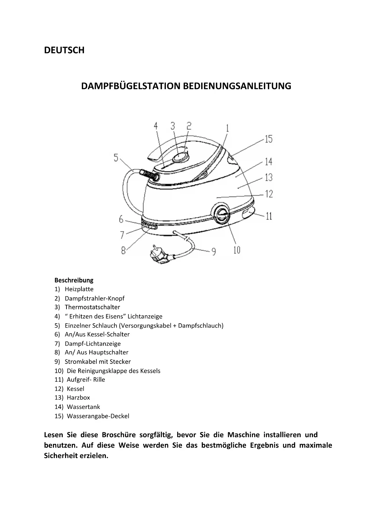 Lesen Sie diese Broschüre sorgfältig, bevor Sie die Maschine installieren und benutzen. Auf diese Weise werden Sie das bestmögliche Ergebnis und maximale Sicherheit erzielen.SICHERHEITSHINWEISE Lesen Sie die folgenden Anweisungen sorgfältig: - Vor dem Gebrauch, überprüfen Sie, dass die Stromversorgung mit der auf dem Nummernschild angegebenen Spannung übereinstimmt. Verbinden Sie das Gerät nur mit einer ordnungsgemäß geerdeten Steckdose (Mindestens 10A). - Im Falle von Inkompatibilität zwischen dem Stecker und Ihrer Steckdose, lassen Sie die Steckdose von einer qualifizierten Elektrofachkraft ersetzen. - Die elektrische Sicherheit von diesem Gerät ist nur dann garantiert, wenn es korrekt, gemäß aktuellen elektrischen Sicherheitsvorschriften geerdet worden ist. Der Hersteller lehnt jede Verantwortung für Schäden, die durch eine unangemessene Erdung des Gerätes entstanden sind. Im Zweifelsfall, wenden Sie sich an eine qualifizierte Elektrofachkraft. - Lassen Sie kein Wasser in der Maschine, wenn die Raumtemperatur 0℃ oder weniger beträgt. - Nach dem Auspacken, überprüfen Sie das Gerät auf Beschädigungen, im Zweifelsfall benutzen Sie das Gerät nicht; kontaktieren Sie einen qualifizierten Techniker. - Verpackungsmaterialien (Plastiktüten, Schaumpolyestern usw.) sind eine potentielle Gefahrenquelle und müssen außer Reichweite von Kindern aufbewahrt werden. Es wird nicht empfohlen, Adapter, Mehrfachsteckdosen oder Verlängerungskabel zu benutzen. Falls es unvermeidlich ist, nutzen Sie immer Adapter, Mehrfachsteckdosen oder Verlängerungskabel, die den aktuellen Sicherheitsvorschriften entsprechen. Überschreiten Sie die auf dem Adapter angegebene maximale Nennleistung nicht. - Das Gerät ist ausschließlich für die Haushaltsnutzung geeignet. Jede andere Verwendung wird als unsachgemäß und dementsprechend gefährlich betrachtet.- Der Hersteller lehnt jede Verantwortung für Schäden, die durch eine unsachgemäße, inkorrekte oder achtlose Nutzung des Gerätes entstehen. - Das Gerät ist nicht dafür geeignet, von Personen (einschließlich Kindern) mit eingeschränkten körperlichen, sensorischen oder geistigen Fähigkeiten oder mangels Erfahrung und Wissen bedient zu werden, es sei denn sie werden beaufsichtigt oder erhielten Anweisungen, wie das Gerät zu benutzen ist, von einer für ihre Sicherheit zuständigen Person. - Bei der Nutzung jedes Elektrogerätes müssen einige Grundregel beachtet werden: - Wenn das Stromkabel beschädigt ist, muss es von dem Hersteller oder seinem Dienstleister, oder einer ähnlich qualifizierten Person ersetzt werden, um Gefährdungen zu vermeiden. -Erlauben Sie Kindern nicht, sich vor dem Gerät zu befinden, wenn der Strahl-Knopf gedrückt ist, da seine Reichweite groß ist. Insbesondere: - Fassen Sie das Gerät nicht mit nassen oder feuchten Händen oder Füssen an. - Benutzen Sie das Gerät nicht in Badezimmern. - Ziehen Sie nicht an dem Stromkabel oder dem Gerät, um den Stecker aus der Steckdose zu entfernen. - Lassen Sie das Gerät nicht den Witterungseinflüssen ausgesetzt (Regen, Sonne, Frost usw.) - Erlauben Sie keinen Kindern und unverantwortlich handelnden Personen das Gerät zu bedienen, es sei denn sie werden beaufsichtigt. - Tauchen Sie das Gerät nicht in Wasser. - Lassen Sie das Eisen nicht unbeaufsichtigt, wenn es angeschaltet ist, da es eine Gefahrenquelle sein kann.- Bevor Sie Reinigungs- oder Wartungshandlungen durchführen oder den Behälter mit Wasser füllen, trennen Sie das Gerät immer von der Hauptstromversorgung, indem Sie den Stecker ziehen. - Im Falle von Versagen oder einer Fehlfunktion, schalten Sie das Gerät aus und versuchen Sie es nicht, Reparaturen durchzuführen. Kontaktieren Sie ein autorisiertes Service- Zentrum und bestehen Sie darauf, originale Ersatzteile zu bekommen. Nichtbeachtung von den obengenannten Regeln kann die Sicherheit des Gerätes beeinträchtigen. - Sollten Sie sich dafür entscheiden, das Gerät nicht mehr zu benutzen, entfernen Sie den Stecker aus der Steckdose und schneiden Sie das Stromkabel durch, um das Gerät komplett funktionsunfähig zu machen. - Das Stromkabel darf von dem Nutzer nicht ersetzt werden, weil dies spezielles Werkzeug benötigt; wenn das Stromkabel beschädigt ist, kontaktieren Sie ein qualifiziertes Service- Zentrum. - Erlauben Sie dem Stromkabel nicht, mit der Bügelplatte in Kontakt zu kommen. - Wenn die Sicherheitsabschaltung interveniert, wird das Eisen nicht mehr funktionieren. Um einen normalen Betrieb wiederherzustellen, kontaktieren Sie eine qualifizierte Fachkraft. - Richten Sie den Dampfstrahler nicht auf eine Person, dies kann extrem gefährlich sein. - Benutzen Sie nicht das Eisen auf nassen Stoffen. - Platzieren Sie nicht das Bügeleisen in der Nähe von Personen, wenn die Platte heiß ist. - Überfüllen Sie den Wassertank nicht und fügen Sie keine Fleckentferner oder ähnliche Produkte zu dem Wassertank oder dem Kessel hinzu. - Entfernen Sie den Stecker aus der Netzsteckdose, wenn das Gerät nicht benutzt wird. Lassen Sie das Gerät nicht unnötigan. - Drehen Sie die Reinigungsklappe nie heraus, wenn das Gerät an die Stromversorgung angeschlossen ist. - Das Gerät muss auf einer flachen Ebene platziert sein, die gegen hohe Temperaturen besonderes resistent ist. - EWG Richtlinie 87/308(D.M. 13/04/89) 。Bewähren Sie die Broschüre als künftige Referenz auf. Dieses Gerät entspricht EWG Richtlinie 87/308(D.M. 13/04/89 bezüglich der Unterdrückung von Funkstörungen.