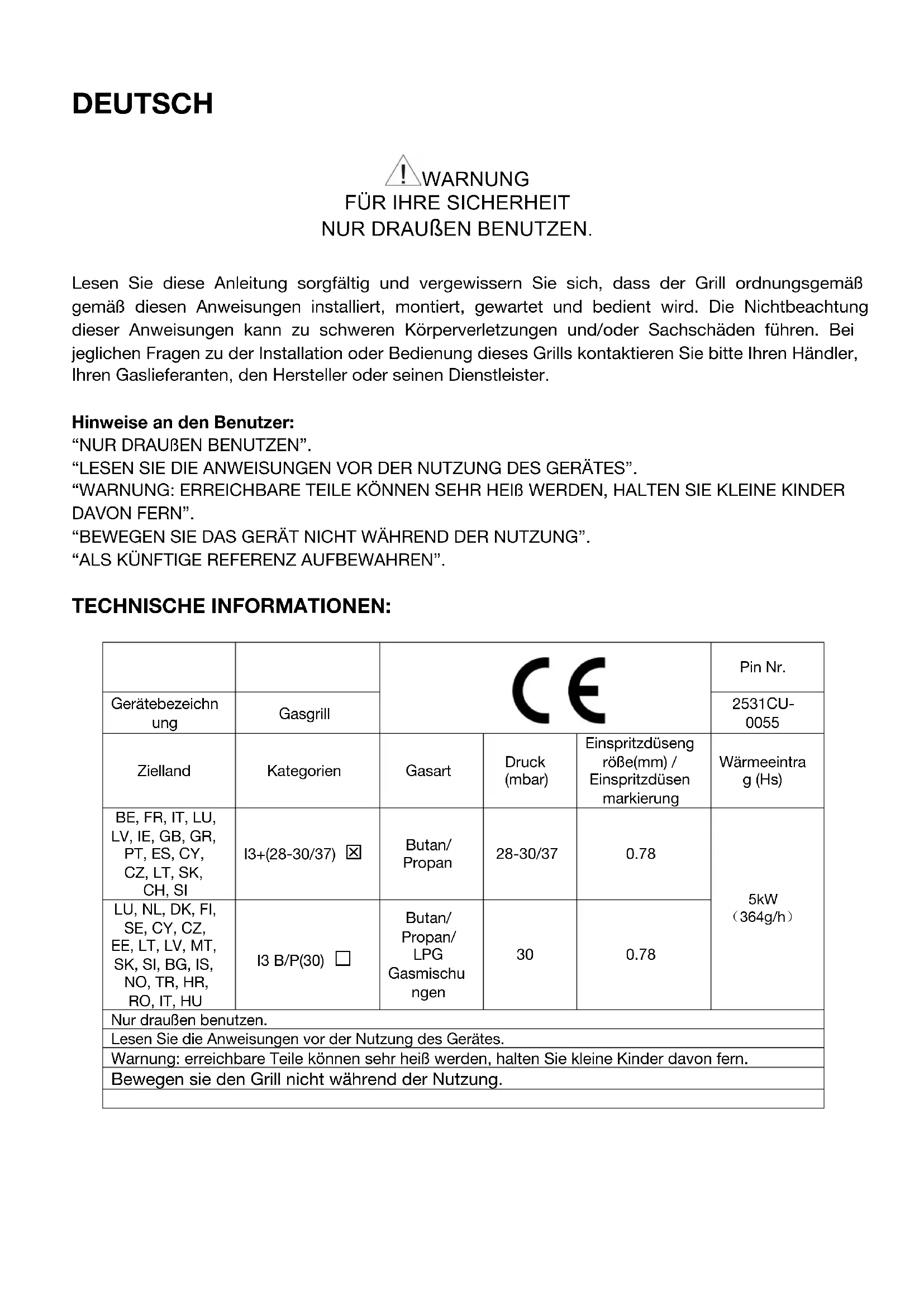 Lesen Sie diese Anleitung sorgfältig und vergewissern Sie sich, dass der Grill ordnungsgemäß gemäß diesen Anweisungen installiert, montiert, gewartet und bedient wird. Die Nichtbeachtung dieser Anweisungen kann zu schweren Körperverletzungen und/oder Sachschäden führen. Bei jeglichen Fragen zu der Installation oder Bedienung dieses Grills kontaktieren Sie bitte Ihren Händler, Ihren Gaslieferanten, den Hersteller oder seinen Dienstleister. Hinweise an den Benutzer: “NUR DRAUßEN BENUTZEN”. “LESEN SIE DIE ANWEISUNGEN VOR DER NUTZUNG DES GERÄTES”. “WARNUNG: ERREICHBARE TEILE KÖNNEN SEHR HEIß WERDEN, HALTEN SIE KLEINE KINDER DAVON FERN”. “BEWEGEN SIE DAS GERÄT NICHT WÄHREND DER NUTZUNG”. “ALS KÜNFTIGE REFERENZ AUFBEWAHREN”. TECHNISCHE INFORMATIONEN: