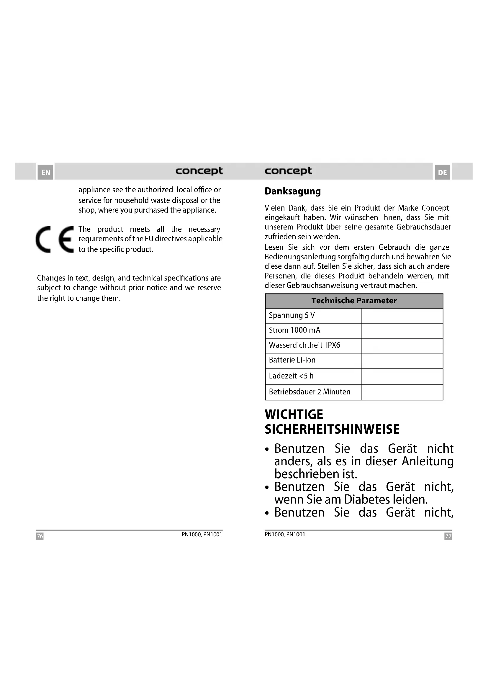 BEDIENUNGSANLEITUNG PN1001 Concept