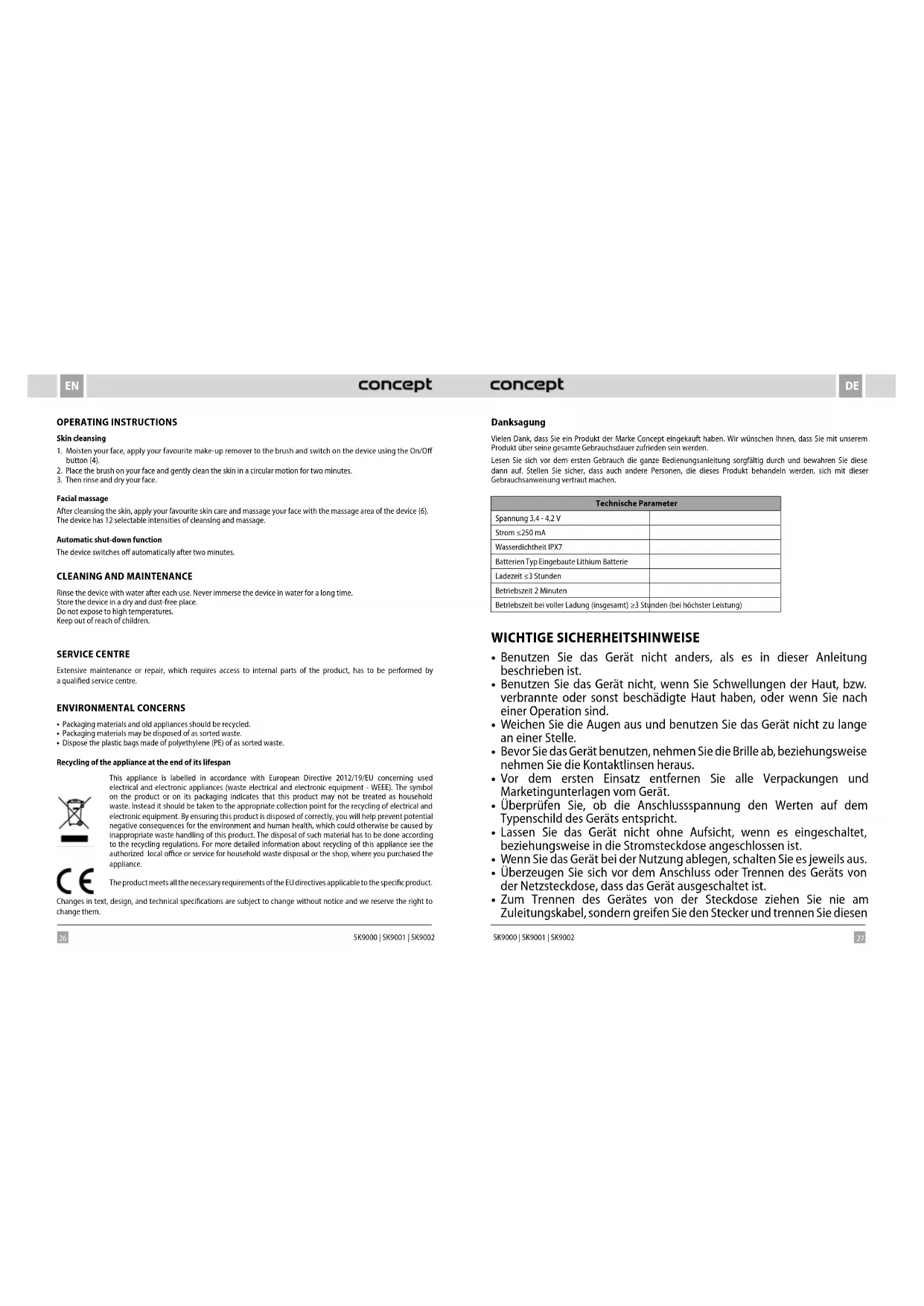 - Zum Trennen des Gerätes von der Steckdose ziehen Sie nie am Zuleitungskabel, sondern greifen Sie den Stecker und trennen Sie diesen28 29 DEDE SK9000 | SK9001 | SK9002 SK9000 | SK9001 | SK9002 von der Steckdose durch das Ziehen.