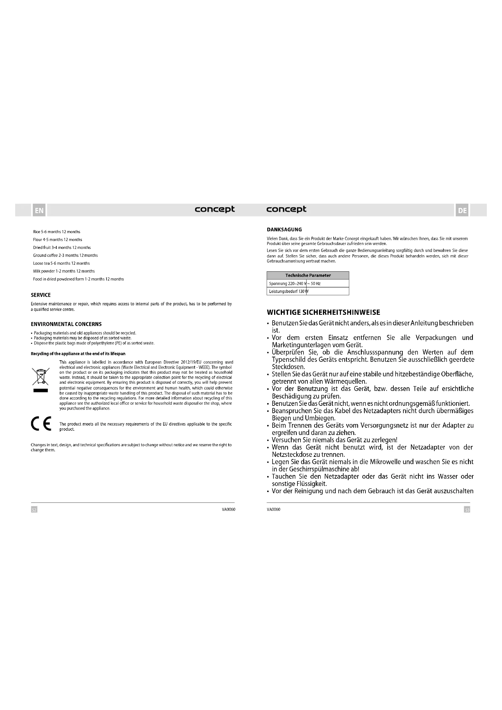 Profi VA0060 - Vakuumverpackungsmaschinen Concept - Kostenlose Bedienungsanleitung