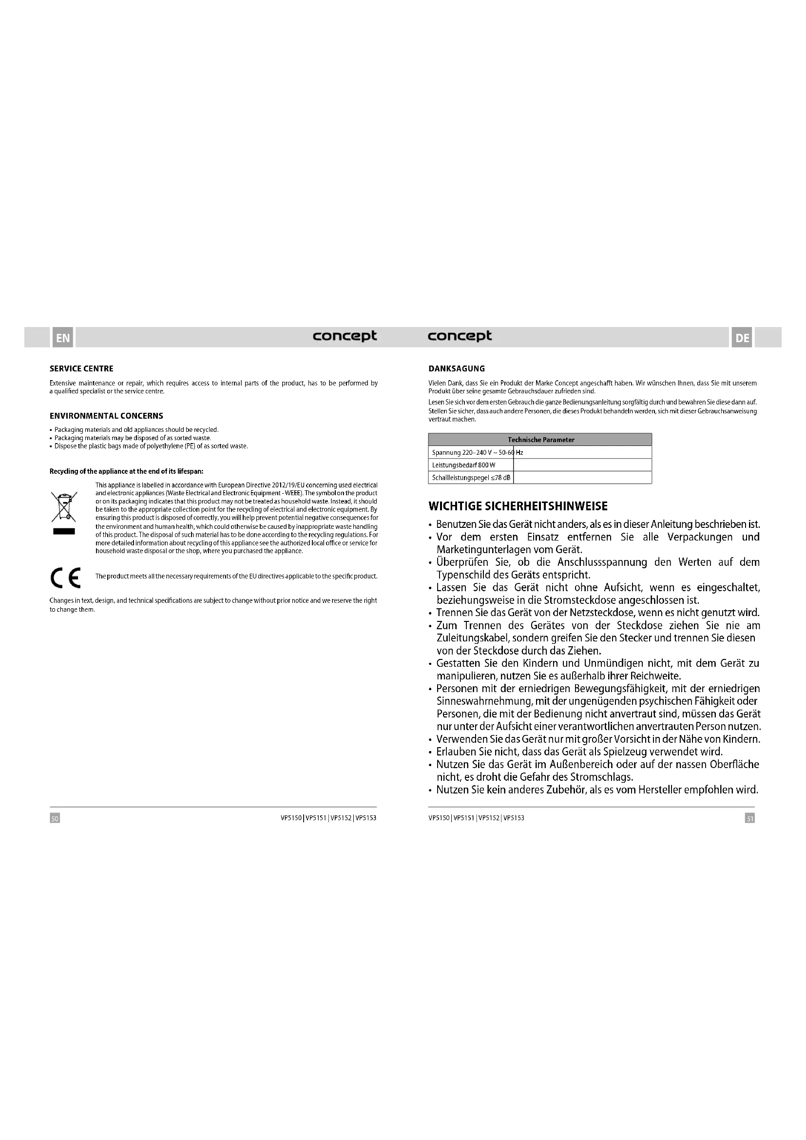 VP5150 | VP5151 | VP5152 | VP5153 DANKSAGUNG Vielen Dank, dass Sie ein Produkt der Marke Concept angeschafft haben. Wir wünschen Ihnen, dass Sie mit unserem Produkt über seine gesamte Gebrauchsdauer zufrieden sind. Lesen Sie sich vor dem ersten Gebrauch die ganze Bedienungsanleitung sorgfältig durch und bewahren Sie diese dann auf. Stellen Sie sicher, dass auch andere Personen, die dieses Produkt behandeln werden, sich mit dieser Gebrauchsanweisung vertraut machen. Technische Parameter Spannung 220–240 V ~ 50-60 Hz Leistungsbedarf 800 W Schallleistungspegel ≤78 dB WICHTIGE SICHERHEITSHINWEISE