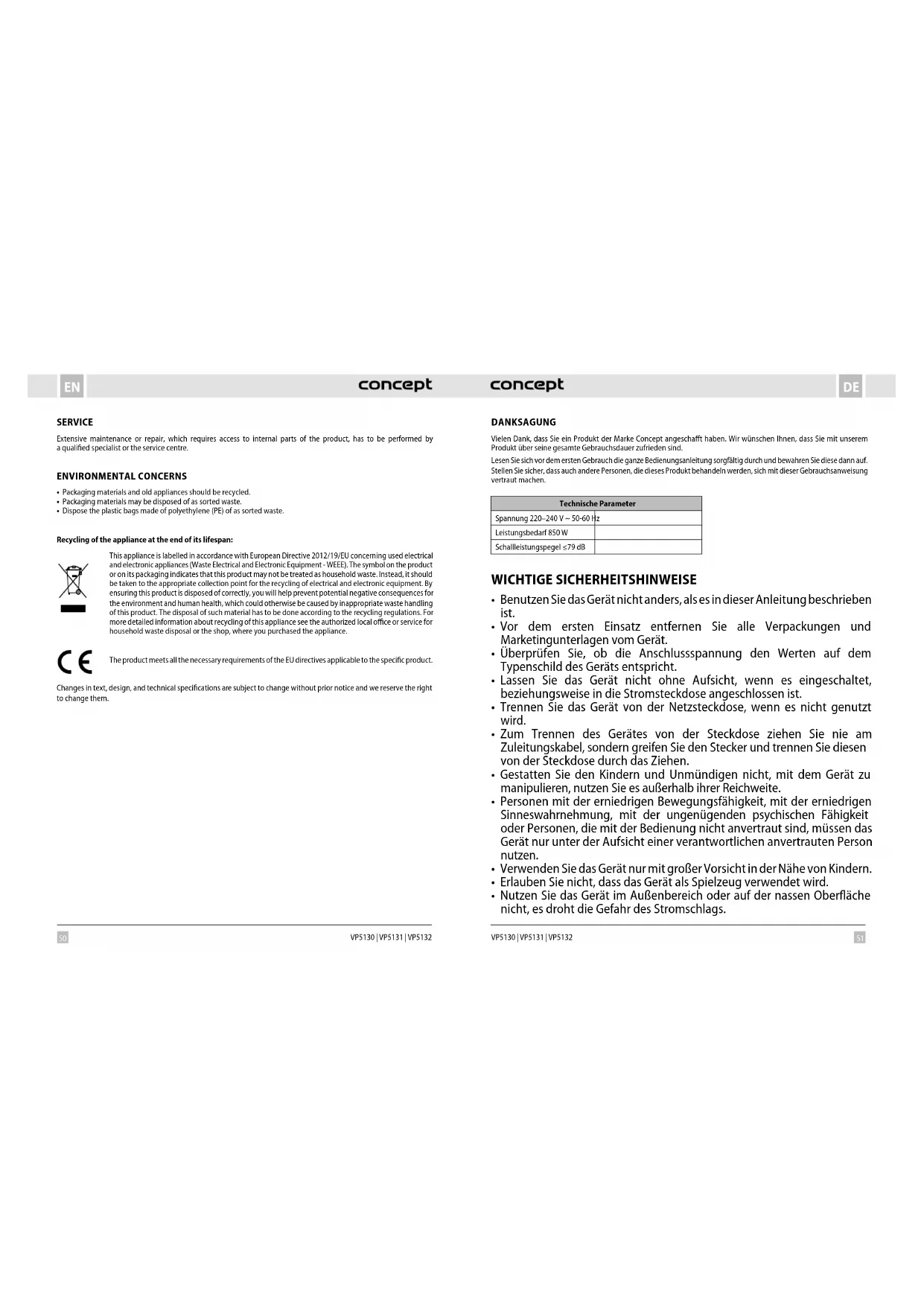 - Die Polyäthylen-Beutel (PE) geben Sie zum Recyceln des Sammelmaterials ab. Recycling des Gerätes am Ende seiner Lebensdauer: Dieses Gerät ist im Einklang mit der Europäischen Richtlinie 2012/19/EU über Elektro- und Elektronik- Altgeräte (WEEE) gekennzeichnet. Das Symbol am Produkt oder an dessen Verpackung gibt an, dass dieses Produkt nicht in den Haushaltsabfall gehört. Es ist auf eine Sammelstelle zum Recyceln der elektrischen und elektronischen Anlagen zu bringen. Durch die Sicherstellung der korrekten Entsorgung dieses Produktes helfen Sie, negative Konsequenzen für die Umwelt und die Gesundheit der Menschen zu verhindern, die durch die unsachgemäße Entsorgung dieses Produktes verursacht würden. Die Entsorgung muss im Einklang mit den Vorschriften für die Abfallbehandlung durchgeführt werden. Ausführlichere Informationen zum Recycling dieses Produkts erhalten Sie bei der zuständigen örtlichen Behörde, dem Dienstleister für Entsorgung von Haushaltsabfall oder in dem Geschäft, wo Sie das Produkt gekauft haben. Dieses Produkt erfüllt sämtliche Grundanforderungen der EU-Richtlinien, die sich darauf beziehen. Lebensmittel sind Die Änderungen im Text, im Design und in den technischen Spezifizierungen können ohne vorherigen Hinweis geändert werden, und wir behalten uns das Recht auf deren Änderungen vor. MERCI Nous vous remercions d’avoir acheté le produit de la marque Concept et nous espérons qu’il vous apportera votre entière satisfaction pendant son utilisation. Lire attentivement le manuel d’emploi avant la première utilisation et le conserver. Faire prendre connaissance du manuel d’emploi par les autres personnes pouvant manipuler le produit. Caractéristiques techniques Tension 220–240 V ~ 50-60Hz Puissance 850 W Niveau de puissance acoustique ≤79 dB PRÉCAUTIONS PARTICULIÈRES DE SÉCURITÉ