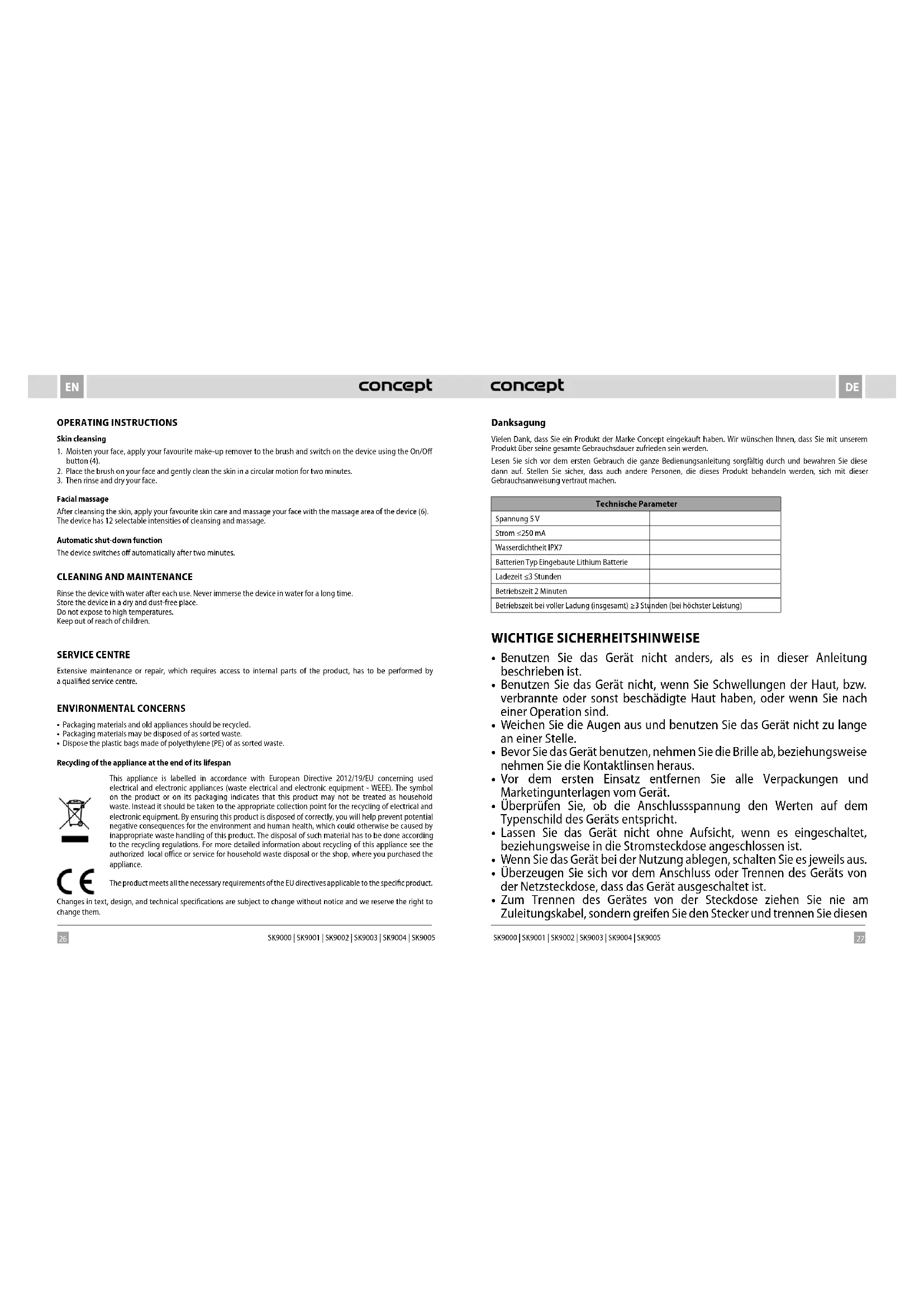 - Zum Trennen des Gerätes von der Steckdose ziehen Sie nie am Zuleitungskabel, sondern greifen Sie den Stecker und trennen Sie diesen28 29 DEDE SK9000 | SK9001 | SK9002 | SK9003 | SK9004 | SK9005 SK9000 | SK9001 | SK9002 | SK9003 | SK9004 | SK9005 von der Steckdose durch das Ziehen.