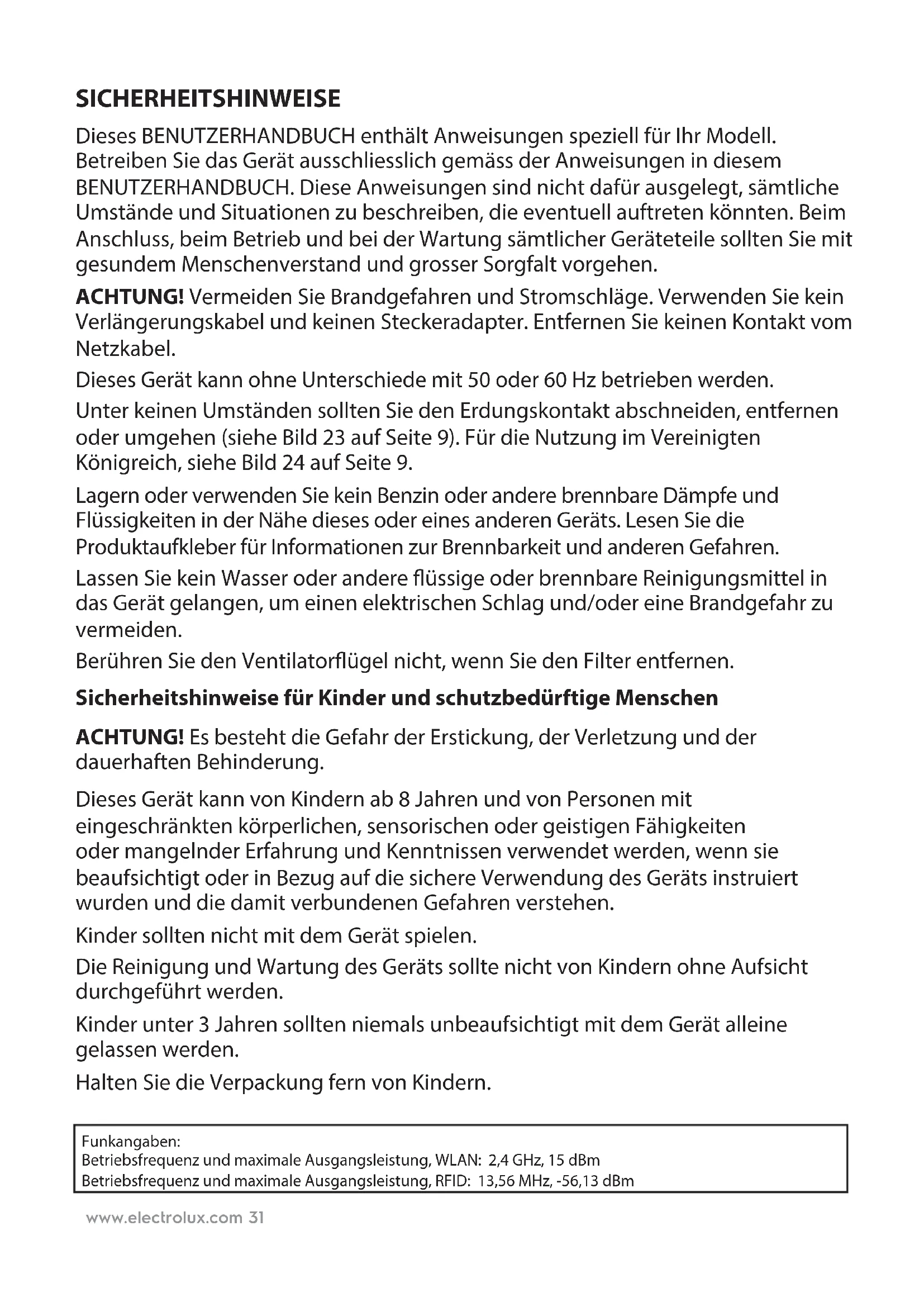 CSwww.electrolux.com 31 SICHERHEITSHINWEISE Dieses BENUTZERHANDBUCH enthält Anweisungen speziell für Ihr Modell. Betreiben Sie das Gerät ausschliesslich gemäss der Anweisungen in diesem BENUTZERHANDBUCH. Diese Anweisungen sind nicht dafür ausgelegt, sämtliche Umstände und Situationen zu beschreiben, die eventuell auftreten könnten. Beim Anschluss, beim Betrieb und bei der Wartung sämtlicher Geräteteile sollten Sie mit gesundem Menschenverstand und grosser Sorgfalt vorgehen. ACHTUNG! Vermeiden Sie Brandgefahren und Stromschläge. Verwenden Sie kein Verlängerungskabel und keinen Steckeradapter. Entfernen Sie keinen Kontakt vom Netzkabel. Dieses Gerät kann ohne Unterschiede mit 50 oder 60 Hz betrieben werden. Unter keinen Umständen sollten Sie den Erdungskontakt abschneiden, entfernen oder umgehen (siehe Bild 23 auf Seite 9). Für die Nutzung im Vereinigten Königreich, siehe Bild 24 auf Seite 9. Lagern oder verwenden Sie kein Benzin oder andere brennbare Dämpfe und Flüssigkeiten in der Nähe dieses oder eines anderen Geräts. Lesen Sie die Produktaufkleber für Informationen zur Brennbarkeit und anderen Gefahren. Lassen Sie kein Wasser oder andere üssige oder brennbare Reinigungsmittel in das Gerät gelangen, um einen elektrischen Schlag und/oder eine Brandgefahr zu vermeiden. Berühren Sie den Ventilatorügel nicht, wenn Sie den Filter entfernen. Sicherheitshinweise für Kinder und schutzbedürftige Menschen ACHTUNG! Es besteht die Gefahr der Erstickung, der Verletzung und der dauerhaften Behinderung. Dieses Gerät kann von Kindern ab 8 Jahren und von Personen mit eingeschränkten körperlichen, sensorischen oder geistigen Fähigkeiten oder mangelnder Erfahrung und Kenntnissen verwendet werden, wenn sie beaufsichtigt oder in Bezug auf die sichere Verwendung des Geräts instruiert wurden und die damit verbundenen Gefahren verstehen. Kinder sollten nicht mit dem Gerät spielen. Die Reinigung und Wartung des Geräts sollte nicht von Kindern ohne Aufsicht durchgeführt werden. Kinder unter 3 Jahren sollten niemals unbeaufsichtigt mit dem Gerät alleine gelassen werden. Halten Sie die Verpackung fern von Kindern. Funkangaben: Betriebsfrequenz und maximale Ausgangsleistung, WLAN: 2,4 GHz, 15 dBm Betriebsfrequenz und maximale Ausgangsleistung, RFID: 13,56 MHz, -56,13 dBmwww.electrolux.com32 Elektrische Informationen ACHTUNG! Vermeiden Sie Brandgefahren und Stromschläge. Wenn Sie nicht sicher sind, ob die Steckdose ausreichend geerdet ist oder durch eine Zeitverzögerungssicherung oder einen Leitungsschutzschalter geschützt ist, lassen Sie einen qualizierten Elektriker die ordnungsgemässe Steckdose gemäss dem National Electrical Code (NFPA 70) und den örtlichen Vorschriften und Verordnungen installieren. Verwenden Sie kein Verlängerungskabel und keinen Steckeradapter. Nehmen Sie das Gerät niemals durch Ziehen am Kabel vom Strom. Halten Sie immer den Stecker fest und ziehen Sie ihn gerade aus der Steckdose. Quetschen, verdrehen oder verknoten Sie das Stromkabel niemals. Beschädigen oder zerschneiden Sie das Stromkabel niemals. Sollte das Stromkabel beschädigt sein, sollte es ausschliesslich von einem von Electrolux authorisierten Fachmann ausgetauscht werden. Dieses Gerät enthält keine Teile zur Wartung durch den Benutzer. Lassen Sie Reparaturarbeiten stets von einem von Electrolux authorisierten Fachmannn durchführen. Sollte das Stromkabel beschädigt sein, muss es durch den Hersteller, seinen authorisierten Servicekräften oder ähnlich qualizierten Personen ausgetauscht werden, um mögliche Gefahren ausschliessen zu können. Stellen Sie sicher, dass Sie das Gerät vor der Reinigung vom Strom nehmen, um einem Stromschlag oder einer Brandgefahr vorzubeugen. Sicherheitsmassnahmen ACHTUNG! Befolgen Sie diese Hinweise, um ernsthaften Verletzungen und tödlichen Unfällen vorzubeugen. Stecken Sie keine Finger oder andere Objekte in den Luftausgabebereich oder in das vordere Gitterfenster des Geräts. Schalten Sie das Gerät nicht an oder aus, indem Sie das Netzteil in die Steckdose stecken/aus der Steckdose ziehen oder indem Sie die Stromzufuhr am Stromkasten ein- oder ausschalten. Beenden Sie im Falle einer Fehlfunktion (Funken, verbrannter Geruch, usw.) sofort die Bedienung des Geräts, nehmen Sie es vom Strom und rufen Sie einen von Electrolux authorisierten Fachmann. Bedienen Sie das Gerät nicht mit feuchten Händen. Ziehen Sie niemals am Stromkabel. ACHTUNG! Vermeiden Sie Schäden am Gerät oder anderen Objekten. Richten Sie den Luftstrom niemals in Richtung eines oenen Kamins oder anderer Hitzequellen, da dies zu Funkenug führen könnte. Klettern Sie niemals auf das Gerät. Legen Sie keine Gegenstände auf dem Gerät ab. Dieses Symbol auf dem Gerät oder auf der Verpackung zeigt an, dass das Produkt kein gewöhnlicher Hausmüll ist.. Bringen Sie das Gerät bitte zum Recycling zu eineroziellen Sammelstelle oder zu einem Electrolux-Servicecenter, wo die Batterie und die elektrischen Teile auf sichere und professionelle Weise entfernt und recycelt werden können. Befolgen Sie Ihre länderspezischen Vorschriften für die separate Sammlung von elektrischen Produkten und wiederauadbaren Batterien. ENTSORGUNG Hängen Sie keine Gegenstände an dem Gerät auf. Stellen Sie niemals Behälter mit Flüssigkeiten auf dem Gerät ab. Stellen Sie die Stromzufuhr für das Gerät ab, wenn es über einen längeren Zeitraum nicht benutzt wird. Benutzen Sie das Gerät ausschliesslich dann, wenn die Luftlter installiert sind. Blockieren und bedecken Sie niemals das Zuluft- Gitterfenster, den Luftausgabebereich und die Auslassönungen. Stellen Sie sicher, dass alle elektrischen/ elektronischen Geräte mindestens 30 cm vom Gerät entfernt sind.
