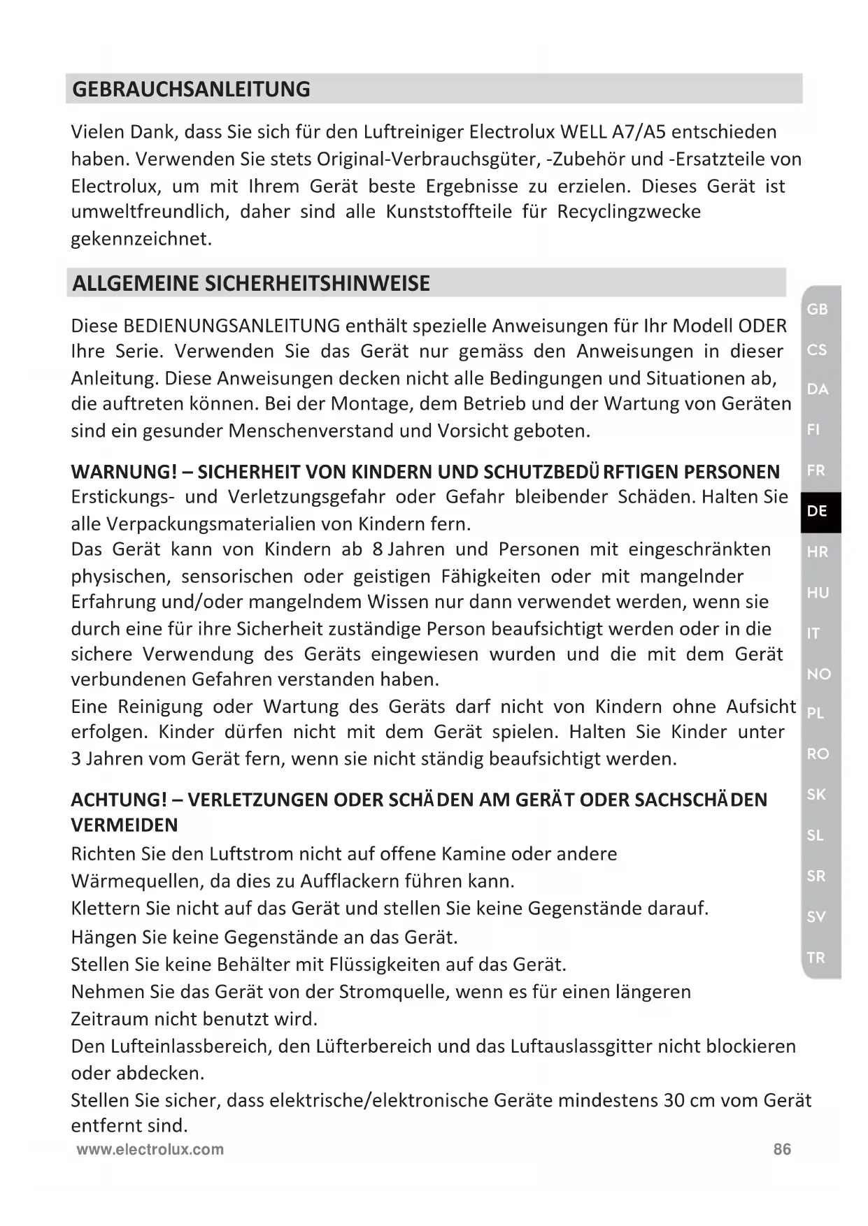Vielen Dank, dass Sie sich für den Luftreiniger Electrolux WELL A7/A5 entschieden haben. Verwenden Sie stets Original-Verbrauchsgüter, -Zubehör und -Ersatzteile von Electrolux, um mit Ihrem Gerät beste Ergebnisse zu erzielen. Dieses Gerät ist umweltfreundlich, daher sind alle Kunststoffteile für Recyclingzwecke gekennzeichnet. ALLGEMEINE SICHERHEITSHINWEISE