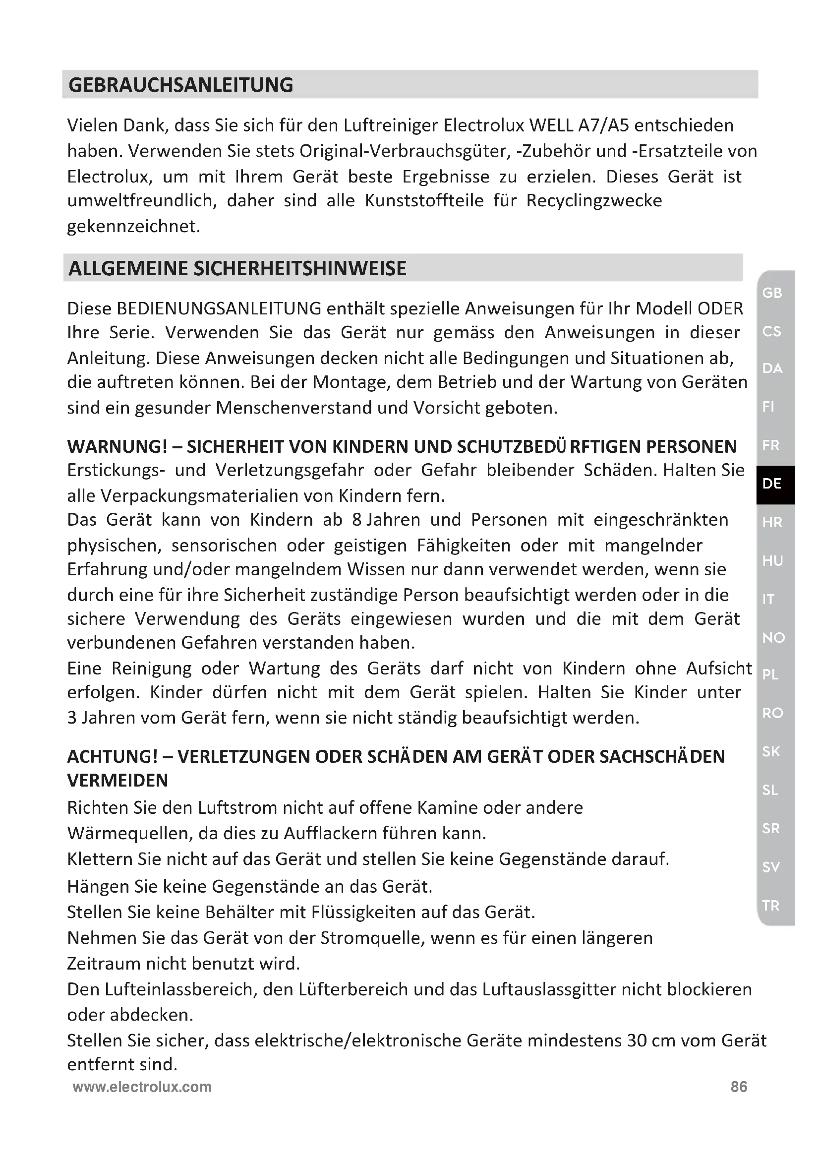 Vielen Dank, dass Sie sich für den Luftreiniger Electrolux WELL A7/A5 entschieden haben. Verwenden Sie stets Original-Verbrauchsgüter, -Zubehör und -Ersatzteile von Electrolux, um mit Ihrem Gerät beste Ergebnisse zu erzielen. Dieses Gerät ist umweltfreundlich, daher sind alle Kunststoffteile für Recyclingzwecke gekennzeichnet. ALLGEMEINE SICHERHEITSHINWEISE