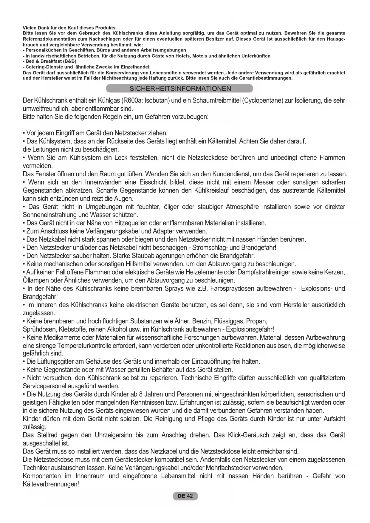 Vielen Dank für den Kauf dieses Produkts. Bitte lesen Sie vor dem Gebrauch des Kühlschranks diese Anleitung sorgfältig, um das Gerät optimal zu nutzen. Bewahren Sie die gesamte Referenzdokumentation zum Nachschlagen oder für einen eventuellen späteren Besitzer auf. Dieses Gerät ist ausschließlich für den Hausge- brauch und vergleichbare Verwendung bestimmt, wie: - Personalküchen in Geschäften, Büros und anderen Arbeitsumgebungen - in landwirtschaftlichen Betrieben, für die Nutzung durch Gäste von Hotels, Motels und ähnlichen Unterkünften - Bed & Breakfast (B&B) - Catering-Dienste und ähnliche Zwecke im Einzelhandel. Das Gerät darf ausschließlich für die Konservierung von Lebensmitteln verwendet werden. Jede andere Verwendung wird als gefährlich erachtet und der Hersteller weist im Fall der Nichtbeachtung jede Haftung zurück. Bitte lesen Sie auch die Garantiebestimmungen. Der Kühlschrank enthält ein Kühlgas (R600a: Isobutan) und ein Schaumtreibmittel (Cyclopentane) zur Isolierung, die sehr umweltfreundlich, aber entflammbar sind. Bitte halten Sie die folgenden Regeln ein, um Gefahren vorzubeugen: