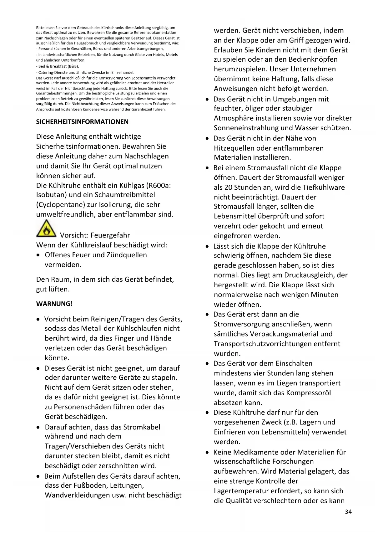 Conformidad Mediante la colocación de la marca en este producto confirmamos el cumplimiento de todos los requisitos legislativos europeos relevantes en materia de seguridad, salud y medio ambiente establecidos para este producto.34 Bitte lesen Sie vor dem Gebrauch des Kühlschranks diese Anleitung sorgfältig, um das Gerät optimal zu nutzen. Bewahren Sie die gesamte Referenzdokumentation zum Nachschlagen oder für einen eventuellen späteren Besitzer auf. Dieses Gerät ist ausschließlich für den Hausgebrauch und vergleichbare Verwendung bestimmt, wie: - Personalküchen in Geschäften, Büros und anderen Arbeitsumgebungen, - in landwirtschaftlichen Betrieben, für die Nutzung durch Gäste von Hotels, Motels und ähnlichen Unterkünften, - Bed & Breakfast (B&B), - Catering-Dienste und ähnliche Zwecke im Einzelhandel. Das Gerät darf ausschließlich für die Konservierung von Lebensmitteln verwendet werden. Jede andere Verwendung wird als gefährlich erachtet und der Hersteller weist im Fall der Nichtbeachtung jede Haftung zurück. Bitte lesen Sie auch die Garantiebestimmungen. Um die bestmögliche Leistung zu erzielen und einen problemlosen Betrieb zu gewährleisten, lesen Sie zunächst diese Anweisungen sorgfältig durch. Die Nichtbeachtung dieser Anweisungen kann zum Erlöschen des Anspruchs auf kostenlosen Kundenservice während der Garantiezeit führen. SICHERHEITSINFORMATIONEN Diese Anleitung enthält wichtige Sicherheitsinformationen. Bewahren Sie diese Anleitung daher zum Nachschlagen und damit Sie Ihr Gerät optimal nutzen können sicher auf. Die Kühltruhe enthält ein Kühlgas (R600a: Isobutan) und ein Schaumtreibmittel (Cyclopentane) zur Isolierung, die sehr umweltfreundlich, aber entflammbar sind. Vorsicht: Feuergefahr Wenn der Kühlkreislauf beschädigt wird: