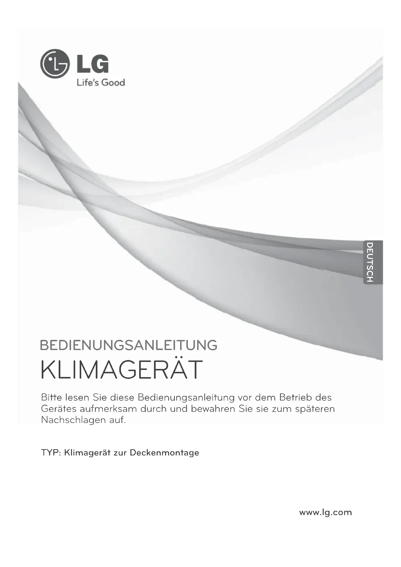 www.lg.com BEDIENUNGSANLEITUNG KLIMAGERÄT Bitte lesen Sie diese Bedienungsanleitung vor dem Betrieb des Gerätes aufmerksam durch und bewahren Sie sie zum späteren Nachschlagen auf. TYP: Klimagerät zur Deckenmontage DEUTSCH2 ENERGIESPARTIPPS DEUTSCH ENERGIESPARTIPPS Die folgenden Hinweise helfen Ihnen, den Stromverbrauch des Klimagerätes zu verringern. Beachten Sie für einen effizienteren Einsatz des Klimagerätes die folgenden Hinweise: