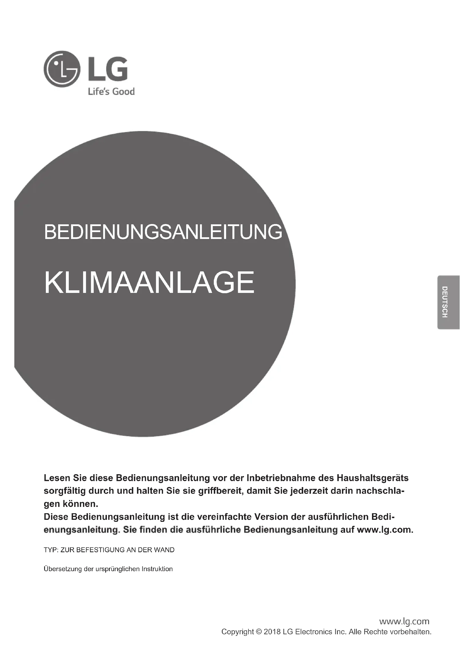 - Appuyez sur le bouton SET/CANCEL pour activer la FUNC sélectionnée.DEUTSCH BEDIENUNGSANLEITUNG KLIMAANLAGE Lesen Sie diese Bedienungsanleitung vor der Inbetriebnahme des Haushaltsgeräts sorgfältig durch und halten Sie sie griffbereit, damit Sie jederzeit darin nachschla- gen können. Diese Bedienungsanleitung ist die vereinfachte Version der ausführlichen Bedi- auf www.lg.com. TYP: ZUR BEFESTIGUNG AN DER WANDÜbersetzung der ursprünglichen Instruktion www.lg.com Copyright © 2018 LG Electronics Inc. Alle Rechte vorbehalten.INHALT Diese Bedienungsanleitung wurde für eine Produktruppe erstellt. Sie kann daher Abbildungen oder Inhalte en- thalten, die sich von Ihrem Modell unterscheiden. Änderungen an dieser Bedienungsanleitung durch den Hersteller bleiben vorbehalten. SICHERHEITSANWEISUNGEN ............................. 3 Wichtige Sicherheitsanweisungen ........................................................... 4 BETRIEB ................................................................... 9 Bedienungshinweise................................................................................ 9 Bauteile und Funktionen