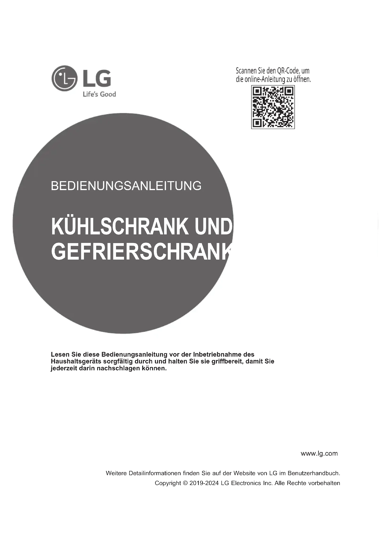 GEFRIERSCHRANK Lesen Sie diese Bedienungsanleitung vor der Inbetriebnahme des Haushaltsgeräts sorgfältig durch und halten Sie sie griffbereit, damit Sie jederzeit darin nachschlagen können. Weitere Detailinformationen finden Sie auf der Website von LG im Benutzerhandbuch. Copyright © 2019-2024 LG Electronics Inc. Alle Rechte vorbehalten Scannen Sie den QR-Code, um die online-Anleitung zu öffnen.INHALTSVERZEICHNIS Diese Bedienungsanleitung kann Abbildungen oder Inhalte enthalten, die sich von Ihrem Modell unterscheiden. Änderungen an dieser Bedienungsanleitung durch den Hersteller bleiben vorbehalten. SICHERHEITSANWEISUNGEN .............................................3 WICHTIGE SICHERHEITSANWEISUNGEN
