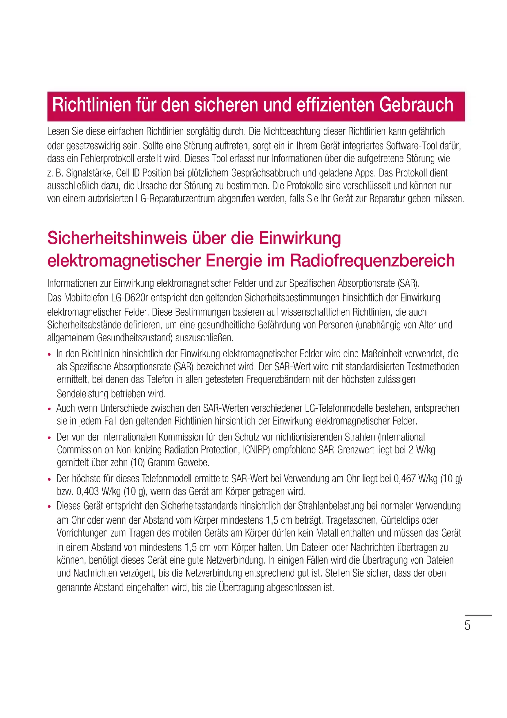 - Häufig gestellte Fragen Inhaltsverzeichnis5 Lesen Sie diese einfachen Richtlinien sorgfältig durch. Die Nichtbeachtung dieser Richtlinien kann gefährlich oder gesetzeswidrig sein. Sollte eine Störung auftreten, sorgt ein in Ihrem Gerät integriertes Software-Tool dafür, dass ein Fehlerprotokoll erstellt wird. Dieses Tool erfasst nur Informationen über die aufgetretene Störung wie z.B. Signalstärke, Cell ID Position bei plötzlichem Gesprächsabbruch und geladene Apps. Das Protokoll dient ausschließlich dazu, die Ursache der Störung zu bestimmen. Die Protokolle sind verschlüsselt und können nur von einem autorisierten LG-Reparaturzentrum abgerufen werden, falls Sie Ihr Gerät zur Reparatur geben müssen. Sicherheitshinweis über die Einwirkung elektromagnetischer Energie im Radiofrequenzbereich Informationen zur Einwirkung elektromagnetischer Felder und zur Spezifischen Absorptionsrate (SAR). Das Mobiltelefon LG-D620r entspricht den geltenden Sicherheitsbestimmungen hinsichtlich der Einwirkung elektromagnetischer Felder. Diese Bestimmungen basieren auf wissenschaftlichen Richtlinien, die auch Sicherheitsabstände definieren, um eine gesundheitliche Gefährdung von Personen (unabhängig von Alter und allgemeinem Gesundheitszustand) auszuschließen. p. 92