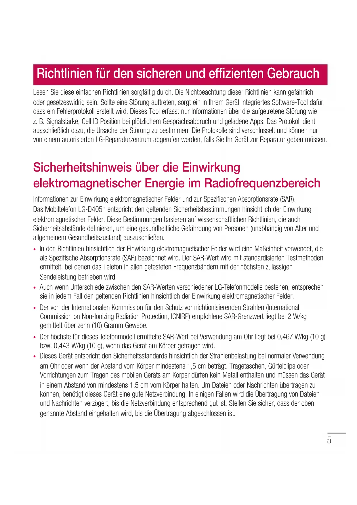- Häufig gestellte Fragen Inhaltsverzeichnis5 Lesen Sie diese einfachen Richtlinien sorgfältig durch. Die Nichtbeachtung dieser Richtlinien kann gefährlich oder gesetzeswidrig sein. Sollte eine Störung auftreten, sorgt ein in Ihrem Gerät integriertes Software-Tool dafür, dass ein Fehlerprotokoll erstellt wird. Dieses Tool erfasst nur Informationen über die aufgetretene Störung wie z.B. Signalstärke, Cell ID Position bei plötzlichem Gesprächsabbruch und geladene Apps. Das Protokoll dient ausschließlich dazu, die Ursache der Störung zu bestimmen. Die Protokolle sind verschlüsselt und können nur von einem autorisierten LG-Reparaturzentrum abgerufen werden, falls Sie Ihr Gerät zur Reparatur geben müssen. Sicherheitshinweis über die Einwirkung elektromagnetischer Energie im Radiofrequenzbereich Informationen zur Einwirkung elektromagnetischer Felder und zur Spezifischen Absorptionsrate (SAR). Das Mobiltelefon LG-D405n entspricht den geltenden Sicherheitsbestimmungen hinsichtlich der Einwirkung elektromagnetischer Felder. Diese Bestimmungen basieren auf wissenschaftlichen Richtlinien, die auch Sicherheitsabstände definieren, um eine gesundheitliche Gefährdung von Personen (unabhängig von Alter und allgemeinem Gesundheitszustand) auszuschließen. p. 92