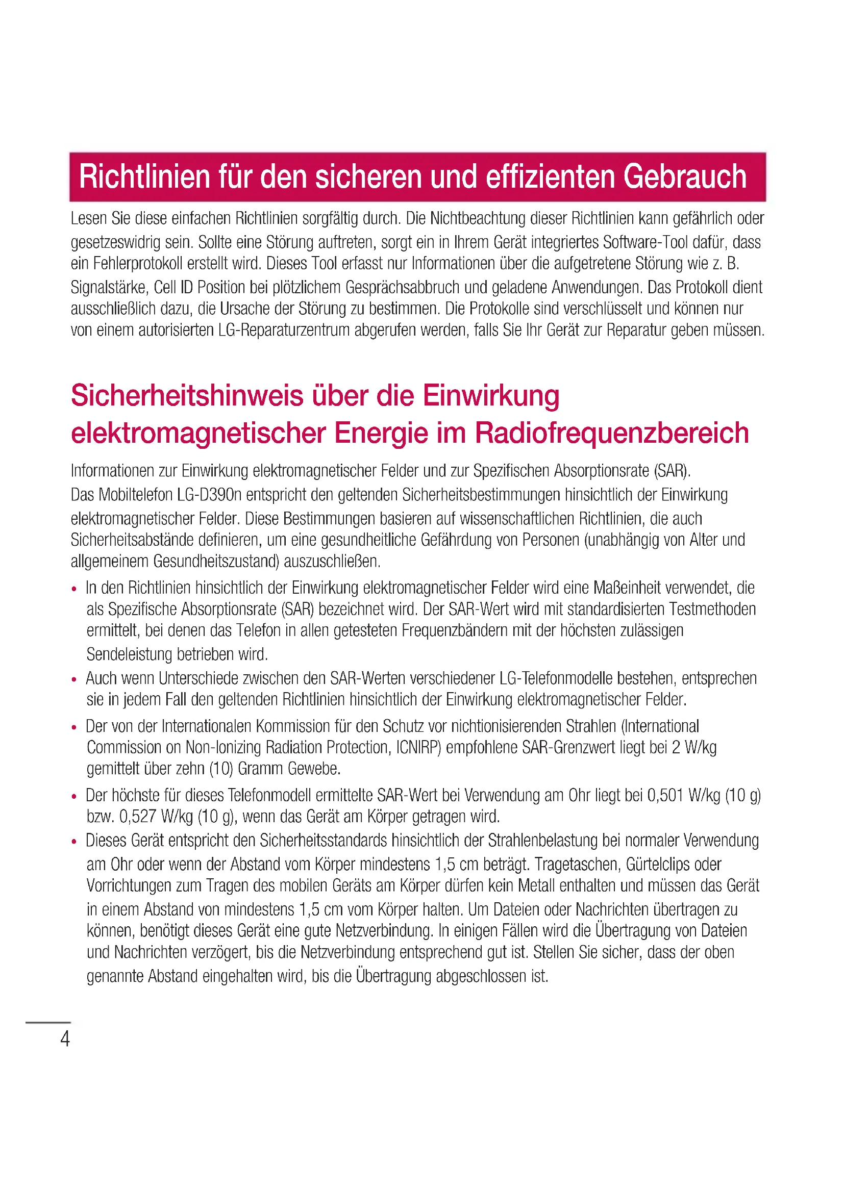 - Auch wenn Unterschiede zwischen den SAR-Werten verschiedener LG-Telefonmodelle bestehen, entsprechen sie in jedem Fall den geltenden Richtlinien hinsichtlich der Einwirkung elektromagnetischer Felder.