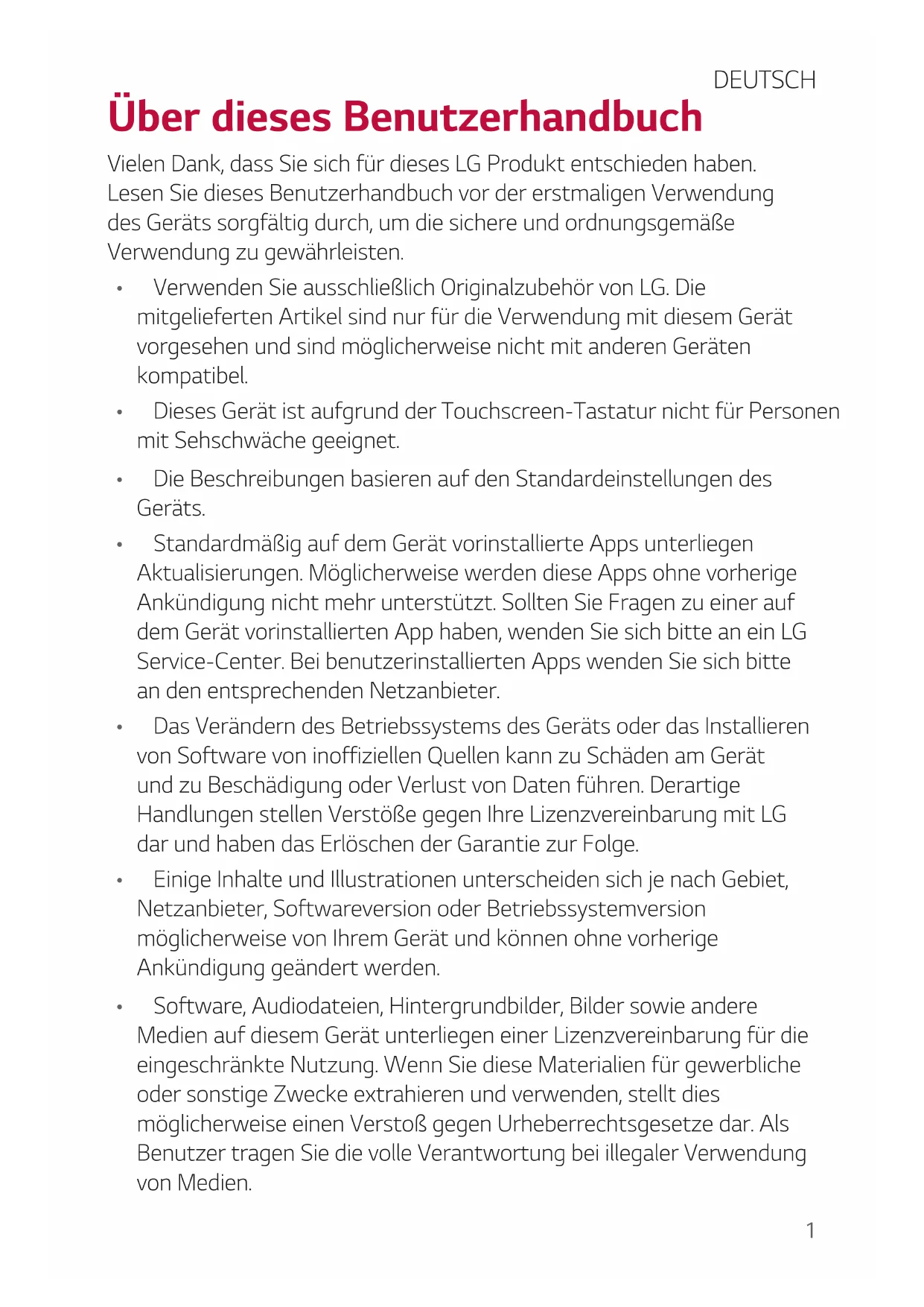 Über dieses Benutzerhandbuch Vielen Dank, dass Sie sich für dieses LG Produkt entschieden haben. Lesen Sie dieses Benutzerhandbuch vor der erstmaligen Verwendung des Geräts sorgfältig durch, um die sichere und ordnungsgemäße Verwendung zu gewährleisten.
