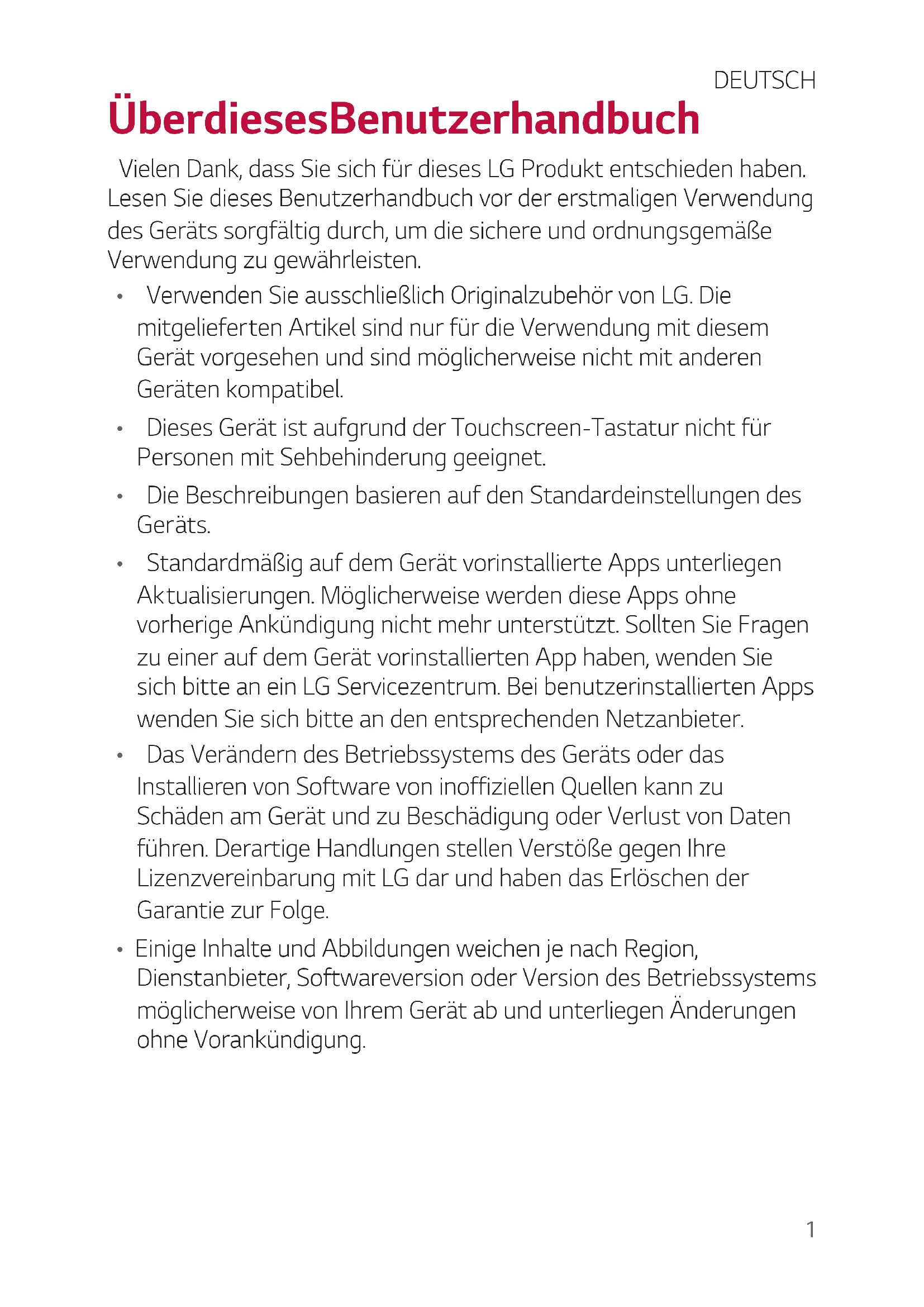 - Das Verändern des Betriebssystems des Geräts oder das Installier en von Software von inoffiziellen Quellen kann zu Schäden am Gerät und zu Beschädigung oder Verlust von Daten führen. Derartige Handlungen stellen Verstöße gegen Ihre Lizenzvereinbarung mit LG dar und haben das Erlöschen der Garantie zur Folge.