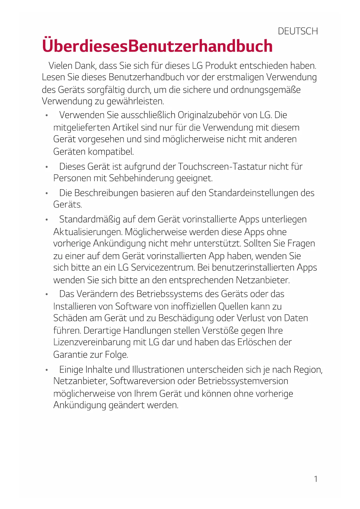 - Das Verändern des Betriebssystems des Geräts oder das Installier en von Software von inoffiziellen Quellen kann zu Schäden am Gerät und zu Beschädigung oder Verlust von Daten führen. Derartige Handlungen stellen Verstöße gegen Ihre Lizenzvereinbarung mit LG dar und haben das Erlöschen der Garantie zur Folge.