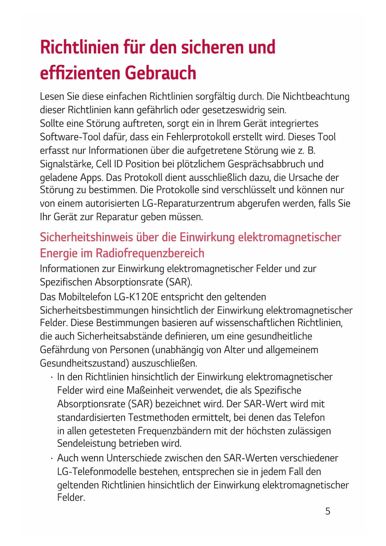 Kontakt für Produktkonformität: ......................935 Richtlinien für den sicheren und efzienten Gebrauch Lesen Sie diese einfachen Richtlinien sorgfältig durch. Die Nichtbeachtung dieser Richtlinien kann gefährlich oder gesetzeswidrig sein. Sollte eine Störung auftreten, sorgt ein in Ihrem Gerät integriertes Software-Tool dafür, dass ein Fehlerprotokoll erstellt wird. Dieses Tool erfasstnurInformationenüberdieaufgetreteneStörungwiez.B. Signalstärke, Cell ID Position bei plötzlichem Gesprächsabbruch und geladene Apps. Das Protokoll dient ausschließlich dazu, die Ursache der Störung zu bestimmen. Die Protokolle sind verschlüsselt und können nur von einem autorisierten LG-Reparaturzentrum abgerufen werden, falls Sie Ihr Gerät zur Reparatur geben müssen. Sicherheitshinweis über die Einwirkung elektromagnetischer Energie im Radiofrequenzbereich Informationen zur Einwirkung elektromagnetischer Felder und zur Spezifischen Absorptionsrate (SAR). Das Mobiltelefon LG-K120E entspricht den geltenden Sicherheitsbestimmungen hinsichtlich der Einwirkung elektromagnetischer Felder. Diese Bestimmungen basieren auf wissenschaftlichen Richtlinien, die auch Sicherheitsabstände definieren, um eine gesundheitliche Gefährdung von Personen (unabhängig von Alter und allgemeinem Gesundheitszustand) auszuschließen.