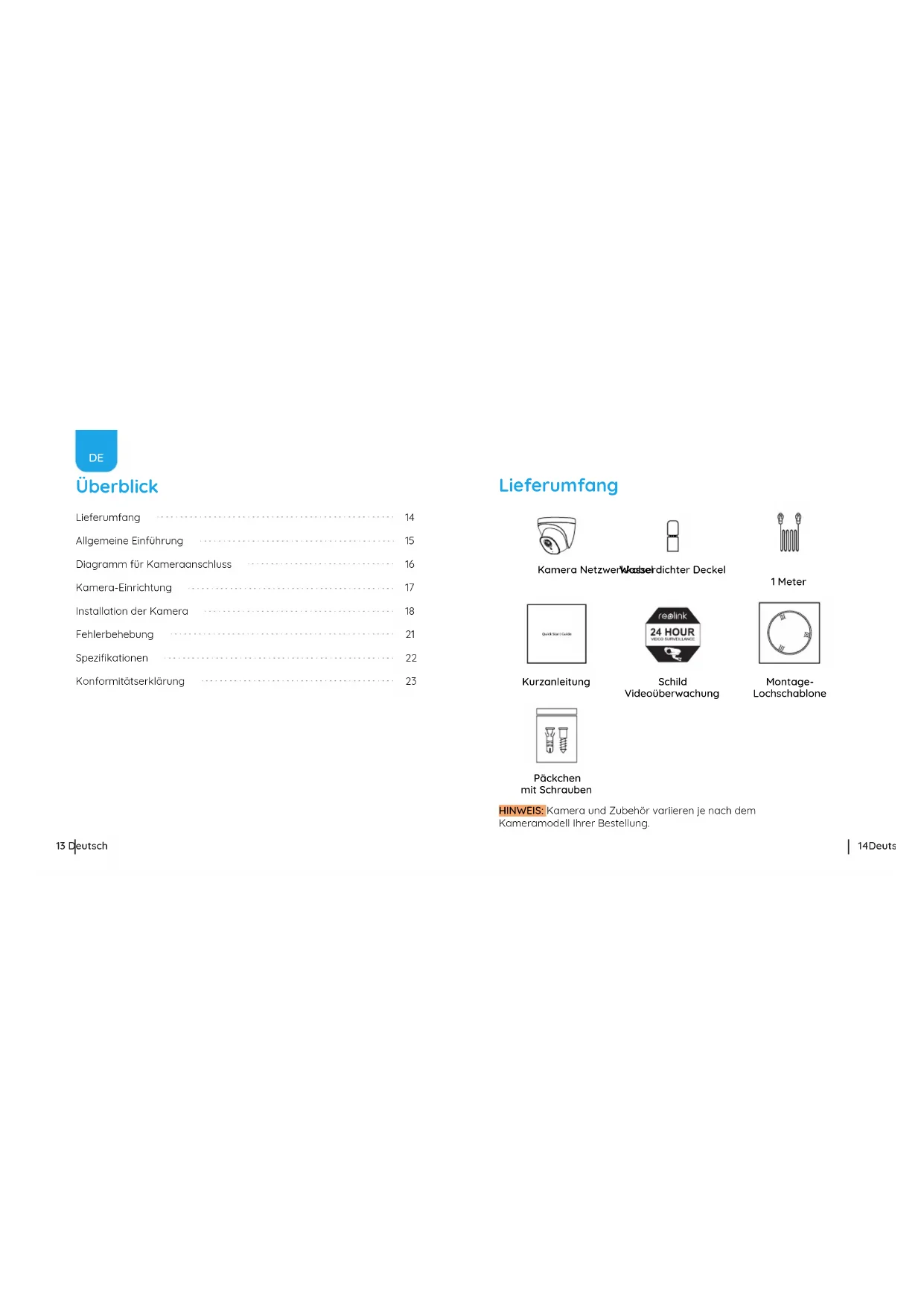 Lieferumfang Allgemeine Einführung Diagramm für Kameraanschluss Kamera-Einrichtung Installation der Kamera Fehlerbehebung Spezifikationen Konformitätserklärung