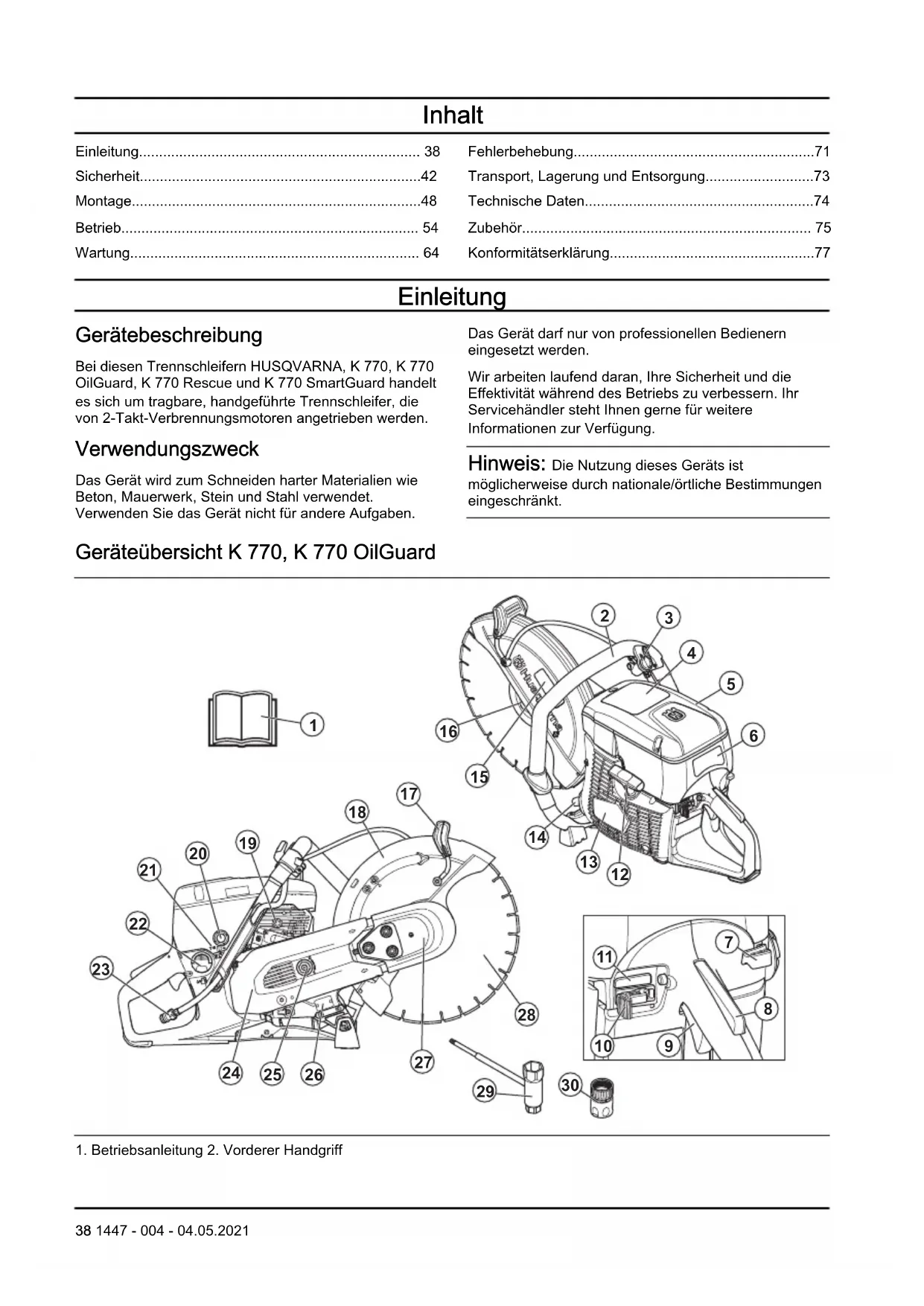 - Konformitätserklärung Einleitung Gerätebeschreibung Bei diesen Trennschleifern HUSQVARNA, K 770, K 770 OilGuard, K 770 Rescue und K 770 SmartGuard handelt es sich um tragbare, handgeführte Trennschleifer, die von 2-Takt-Verbrennungsmotoren angetrieben werden. Verwendungszweck Das Gerät wird zum Schneiden harter Materialien wie Beton, Mauerwerk, Stein und Stahl verwendet. Verwenden Sie das Gerät nicht für andere Aufgaben. Das Gerät darf nur von professionellen Bedienern eingesetzt werden. Wir arbeiten laufend daran, Ihre Sicherheit und die Effektivität während des Betriebs zu verbessern. Ihr Servicehändler steht Ihnen gerne für weitere Informationen zur Verfügung. Hinweis: Die Nutzung dieses Geräts ist möglicherweise durch nationale/örtliche Bestimmungen eingeschränkt. Geräteübersicht K 770, K 770 OilGuard p. 77