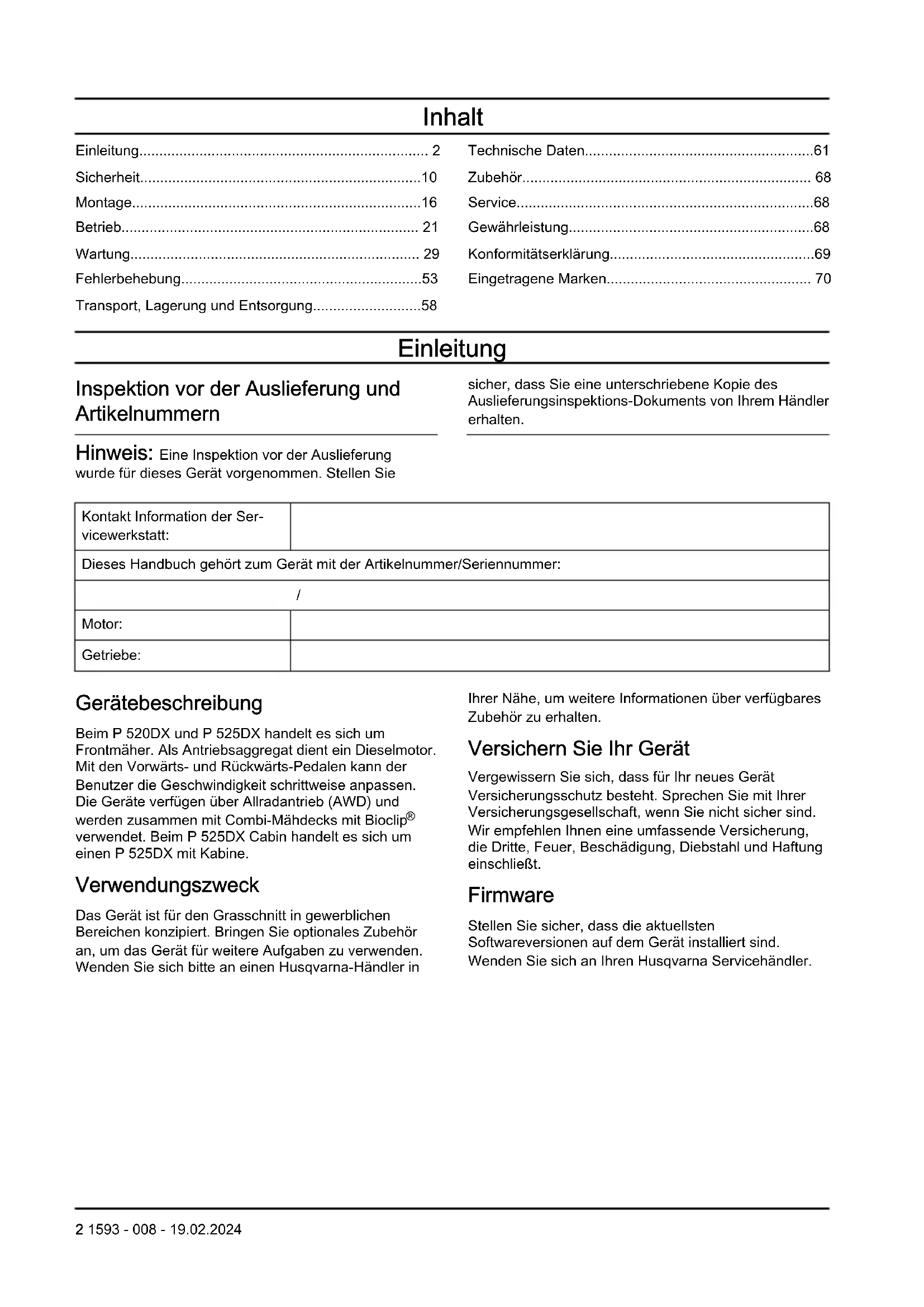 verwendet. Beim P 525DX Cabin handelt es sich um einen P 525DX mit Kabine. Verwendungszweck Das Gerät ist für den Grasschnitt in gewerblichen Bereichen konzipiert. Bringen Sie optionales Zubehör an, um das Gerät für weitere Aufgaben zu verwenden. Wenden Sie sich bitte an einen Husqvarna-Händler in Ihrer Nähe, um weitere Informationen über verfügbares Zubehör zu erhalten. Versichern Sie Ihr Gerät Vergewissern Sie sich, dass für Ihr neues Gerät Versicherungsschutz besteht. Sprechen Sie mit Ihrer Versicherungsgesellschaft, wenn Sie nicht sicher sind. Wir empfehlen Ihnen eine umfassende Versicherung, die Dritte, Feuer, Beschädigung, Diebstahl und Haftung einschließt. Firmware Stellen Sie sicher, dass die aktuellsten Softwareversionen auf dem Gerät installiert sind. Wenden Sie sich an Ihren Husqvarna Servicehändler. 2 1593 - 008 - 19.02.2024Geräteübersicht (P 520DX, P 525DX)