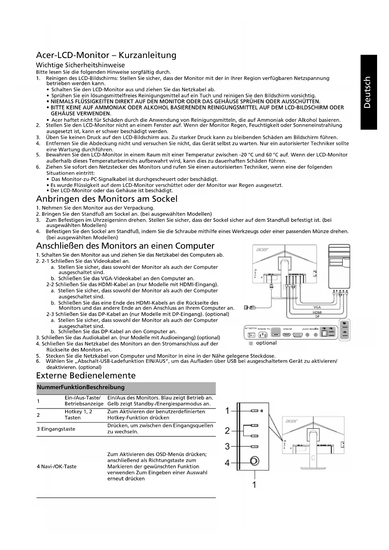 (typisch) Kontrast 100000000:1 Max. (ACM) Einsehbarer Winkel 178° (H) 178° (V) (CR = 10) Reaktionszeit 4 ms (G zu G) Bildschirmtyp In-Plane-Switching H-Frequenz VGA/HDMI: 30 - 85 kHz DP: 85 - 85 kHz V-Frequenz VGA/HDMI: 56 - 76 Hz DP: 48 - 75 Hz Displayfarben 16,7 Millionen Pixelfrequenz 174,5 MHz Maximale Auflösung VGA: 1920 x 1080 @ 60 Hz HDMI/DP: 1920 x 1080 @ 75 Hz Plug & Play VESA DDCCI/DDC2B Stromverbrauch Eingeschaltet 26 W Ruhemodus 0,5 W Ausgeschaltet 0,3 W Eingangsbuchse D-Sub HDMI (nur Modelle mit HDMI-Eingang) DP (nur Modelle mit DP-Eingang) Eingangsvideosignal Analog: 0,7 Vp-p (Standard), 75 OHM, Positiv HDMI (nur Modelle mit HDMI-Eingang) (optional) DP (nur Modelle mit DP-Eingang) (optional) Lautsprecher 2 W x 2 (nur Modelle mit Audioeingang) (optional) USB USB 3.0 x 4 (optional) Maximale Bildschirmgröße Horizontal: 597,88 mm Vertikal: 336,31 mm Stromquelle 100 - 240 V, 50/60 Hz Umgebungsbedingungen Betriebstemperatur: 0 bis 40 °C Lagertemperatur: -20 bis 60 °C Luftfeuchtigkeit bei Betrieb: 20 % bis 80 % Abmessungen 612,3 (B) x 401,1 bis 521,1 (H) x 259,79 (T) mm Gewicht (netto) 7,88 kg (netto) Daten zur Mechanik Neigung: -5° bis +25° (nur am höchsten Punkt können 25 Grad Rückwärtsneigung des Höhenwinkels erzielt werden) Schwenken: -45° bis +45° Höheneinstellung: 0 mm bis 120 mm Drehgelenk: -90° bis +90° Abnehmbarer Standfuß: Ja Externe Bedienelemente Schalter/Tasten Ein-/Aus-Taste Hotkey 1 Hotkey 2 Eingang Menü/Navi/OK Funktionen Kontrast Helligkeit Schwarzverst. Blaues Licht* ACM Ein/Aus Superscharf H.Position (nur Modelle mit analogem Eingang) V.Position (nur Modelle mit analogem Eingang) Takt (nur Modelle mit analogem Eingang) Fokus (nur Modelle mit analogem Eingang) Autom. Abgl. (nur Modelle mit analogem Eingang) Gamma Farbtemp. Modi sRGB Grauskala-Modus 6-Achs.-Sättig, 6-Achs.-Farbton Lautstärke Stumm Overdrive Adaptive-Sync Sprache OSD-Dauer Transparenz OSD-Sperre Eingang Auto-Quelle Bildformate Schnelltastenzuweisung DDC/CI Ein/Aus HDMI-Schwarzp. Schnellstartmod. Abschalt-USB-Ladefunktion Displayinformationen Alle Einst. rücksetzen Beenden Die genaue technische Ausstattung ist je nach Modell und/oder Region unterschiedlich.Español Guía de inicio rápido del monitor LCD de Acer Instrucciones de seguridad importantes Lea detenidamente las siguientes instrucciones. 1. Para limpiar la pantalla del monitor LCD: Asegúrese de que los parámetros eléctricos del monitor permiten utilizarlo con la corriente de CA disponible en su ubicación.• Apague el monitor LCD y desconecte el cable de alimentación.