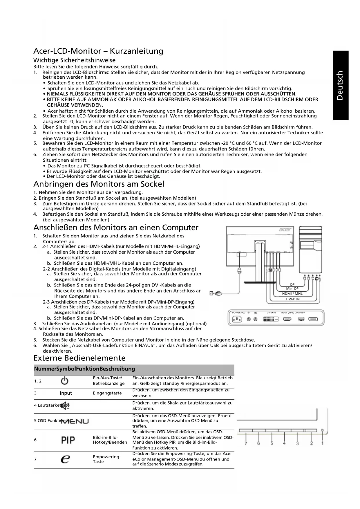 Input EingangstasteDrücken, um zwischen den Eingangsquellen zu wechseln. 4 LautstärketasteDrücken, um die Skala zur Lautstärkeauswahl zu aktivieren.5 OSD-FunktionenDrücken, um das OSD-Menü anzuzeigen. Erneut drücken, um eine Auswahl im OSD-Menü zu treffen. Bild-im-Bild-Hotkey/BeendenBei aktivem OSD-Menü drücken, um das OSD-Menü zu verlassen. Drücken Sie bei inaktivem OSD-Menü den Hotkey PIP, um die Bild-im-Bild-Funktion zu aktivieren. Empowering-TasteDrücken Sie die Empowering-Taste, um das Acer eColor Management-OSD-Menü zu öffnen und auf die Szenario Modes zuzugreifen. POWERDVI-D INHDMI (MHL) DPMini DPMini DP DVI-D INHDMI / MHLPOWERDVI-D INHDMI (MHL) DPMini DPDeutsch Vorschriften und Sicherheitshinweise FCC-Hinweis Dieses Gerät wurde getestet und erfüllt die Grenzwerte für ein digitales Gerät der Klasse B gemäß Teil 15 der FCC-Vorschriften. Diese Grenzwerte sollen einen angemessenen Schutz gegen Interferenzen bei der Installation in einem Wohngebiet bieten. Dieses Gerät erzeugt, verwendet und gibt möglicherweise Funkfrequenzenergie ab und kann, wenn es nicht gemäß den Anweisungen installiert und verwendet wird, Störungen des Funkverkehrs verursachen. Es gibt jedoch keine Garantie dafür, dass bei einer bestimmten Installation keine Störungen auftreten. Wenn dieses Gerät Störungen des Radio- oder Fernsehempfangs verursacht, was sich durch Aus- und Einschalten des Geräts feststellen lässt, kann der Benutzer versuchen, die Störungen durch eine oder mehrere der folgenden Maßnahmen zu beseitigen: Neuausrichtung oder Versetzen der Empfangsantenne Vergrößern des Abstands zwischen dem Gerät und dem Receiver Anschließen des Geräts an eine Steckdose eines anderen Stromkreises als den, an dem der Receiver angeschlossen ist Zu Rate ziehen des Händlers oder eines erfahrenen Radio-/Fernsehtechnikers CE-Konformitätserklärung Acer Inc. erklärt hiermit, dass dieser LCD-Monitor den grundlegenden Anforderungen und anderen relevanten Bestimmungen der EMV-Richtlinie 2014/30/EU, der Niederspannungsrichtlinie 2014/35/EU und der RoHS-Richtlinie 2011/65/EU sowie der Richtlinie 2009/125/EG zur Schaffung eines Rahmens für die Festlegung von Anforderungen an die umweltgerechte Gestaltung energieverbrauchsrelevanter Produkte entspricht. Hinweis: Heben Sie den Monitor nicht an der Unterseite an, um Schäden am Monitor zu vermeiden. Hinweis: Abgeschirmte Kabel Alle Verbindungen zu anderen Computing-Geräten müssen über abgeschirmte Kabel erfolgen, um die Einhaltung der EMV- Richtlinien sicherzustellen. Hinweis: Peripheriegeräte Nur Peripheriegeräte (Eingabe-/Ausgabegeräte, Terminals, Drucker usw.), die die Grenzwerte der Klasse B erfüllen, dürfen an dieses Gerät angeschlossen werden. Der Anschluss von Peripheriegeräten, die diese Grenzwerte nicht erfüllen, kann Störungen des Radio- und Fernsehempfangs hervorrufen. Vorsicht Änderungen oder Modifikationen, die nicht ausdrücklich durch den Hersteller genehmigt wurden, können dazu führen, dass die Betriebserlaubnis, die dem Benutzer von der Federal Communications Commission für dieses Produkt erteilt wurde, erlischt. Betriebsbedingungen Dieses Gerät entspricht Teil 15 der FCC-Vorschriften. Der Betrieb unterliegt folgenden zwei Bedingungen: (1) Dieses Gerät darf keine schädlichen Interferenzen verursachen und (2) dieses Gerät muss alle empfangenen Interferenzen annehmen, einschließlich Interferenzen, die zu einem unerwünschten Betrieb führen können. Hinweis: Benutzer in Kanada Dieses digitale Gerät der Klasse B entspricht der kanadischen Norm ICES-003. Remarque à l'intention des utilisateurs canadiens Cet appareil numérique de la classe B est conforme à la norme NMB-003 du Canada. Entsorgung von Elektrogeräten durch Benutzer in Privathaushalten in der EU Dieses Symbol auf dem Produkt oder seiner Verpackung weist darauf hin, dass dieses Produkt nicht über den normalen Hausmüll entsorgt werden darf. Es liegt in Ihrer Verantwortung, Ihre Altgeräte zur Entsorgung an einer Rücknahmestelle für das Recycling und die Entsorgung von elektrischen und elektronischen Geräten abzugeben. Die getrennte Sammlung und das Recycling von Altgeräten nach Ablauf der Lebensdauer tragen zur Erhaltung der natürlichen Ressourcen bei und garantieren eine Wiederverwertung, die die Gesundheit der Menschen und die Umwelt schont. Weitere Informationen dazu, wo sich Rücknahmestellen für Ihre Altgeräte befinden, erhalten Sie bei Ihrer Stadtverwaltung, den örtlichen Müllentsorgungsbetrieben oder im Geschäft, in dem Sie das Produkt erworben haben. Warnung zu Magneten Bestimmte elektronische Geräte, wie z.B. Festplatten, USB-Geräte, Tablet-PCs, Notebooks, Handys, Uhren, Kopfhörer, Lautsprecher, Kreditkarten, Magnetkarten usw., reagieren empfindlich auf magnetische Felder und können dauerhaft geschädigt oder vorübergehend deaktiviert werden, wenn sie einem zu starken Magnetfeld ausgesetzt sind. Elektronische Geräte sollten nicht in der Nähe von oder direkt auf dem magnetischen Bereich des Standfußes abgelegt werden. MagnetDeutsch TECHNISCHE DATEN Handbücher und andere Dokumente für Ihr Acer-Produkt finden Sie auf der offiziellen Acer-Support-Website. *Der jährliche Energieverbrauch berechnet sich anhand des typischen Stromverbrauchs von 4 Stunden pro Tag, 365 Tage im Jahr. LCD-Bildschirm System TFT-LCD-Farbbildschirm Größe 32”W (81 cm) Pixelabstand 0,1845 mm (H) x 0,1845 mm (V) Helligkeit 350 cd/m